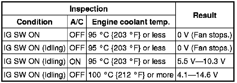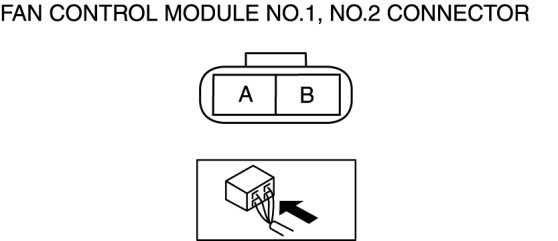 5. Measure the voltage at terminal A of the fan control module connector (2 terminals) as shown in the table.