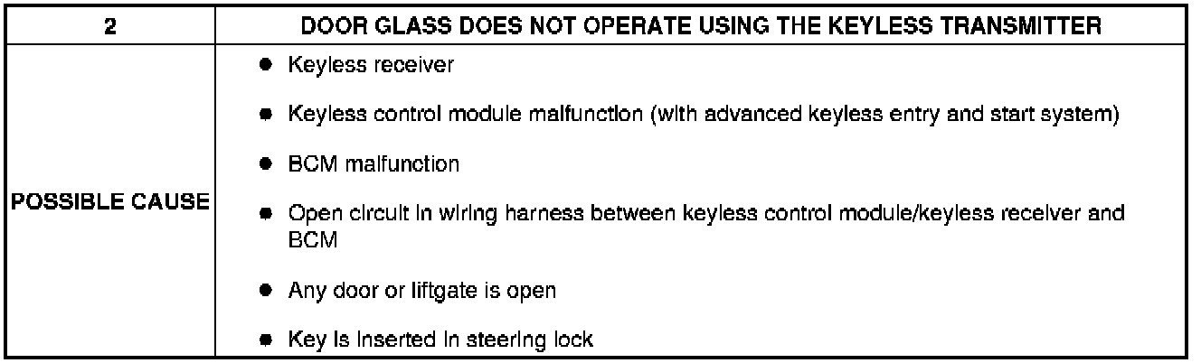 No.2 DOOR GLASS DOES NOT OPERATE USING THE KEYLESS TRANSMITTER [POWER WINDOW SYSTEMS (EXTERIOR OPEN FUNCTION)]