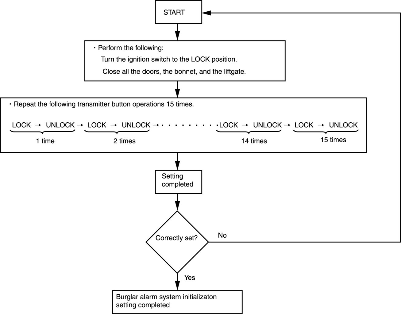 - The initialization must be performed when the BCM is replaced with a new one. If the initialization is not performed, the transition time from the initial mode to the stand-by mode (approx. 20 s) cannot be set, resulting in the possibility of the theft-deterrent system activating immediately due to a mis-operation after an occupant gets out of the vehicle.