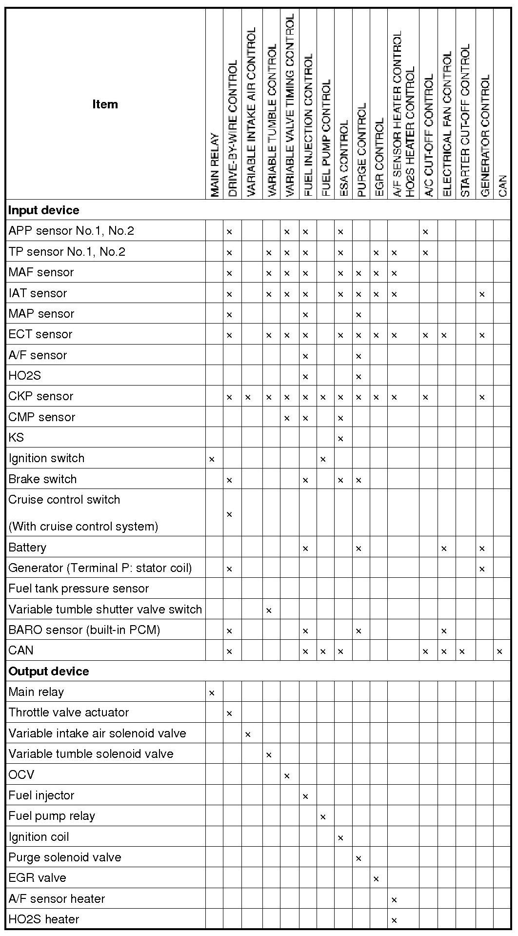 Control System Device and Control Relationship Chart
