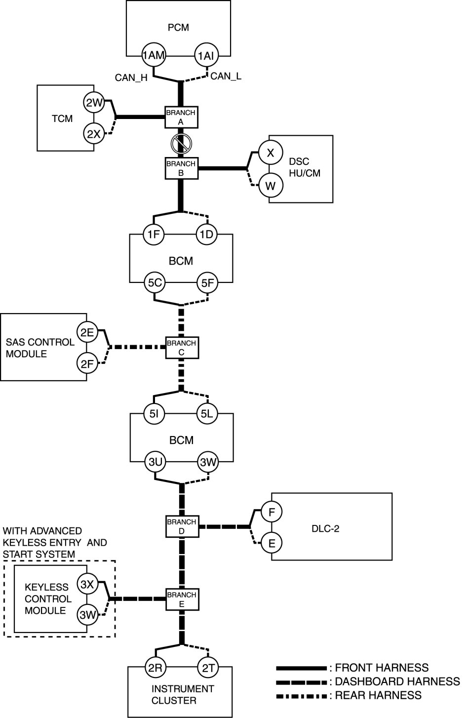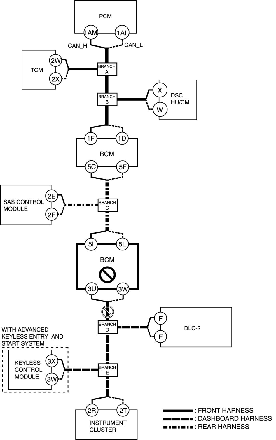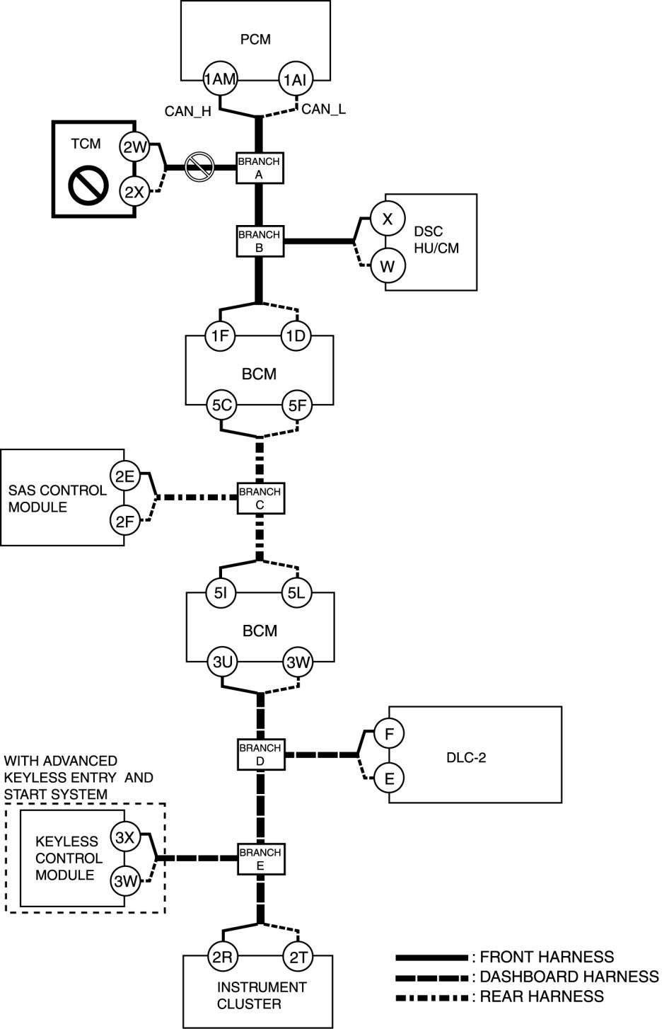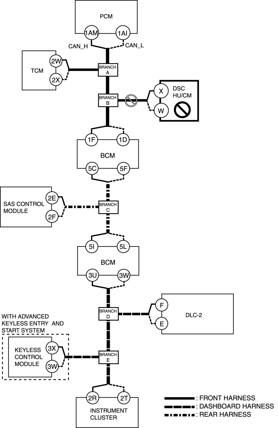 - Wiring harness between DSC HU/CM terminal W and branch B