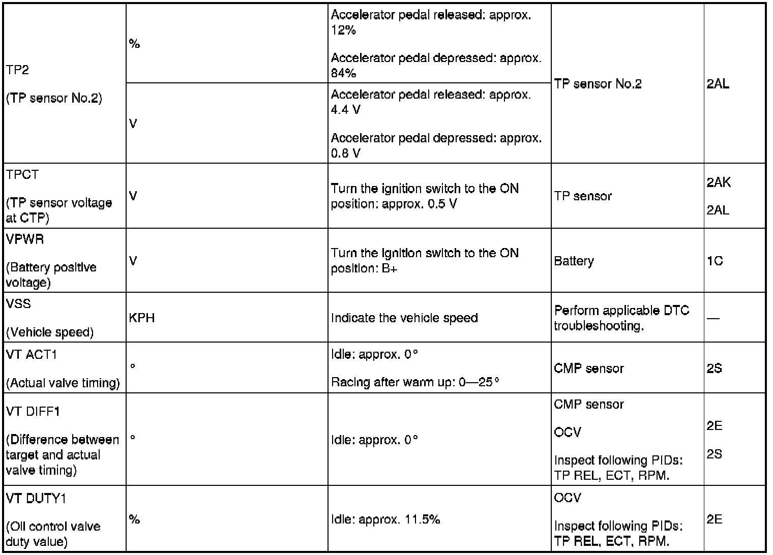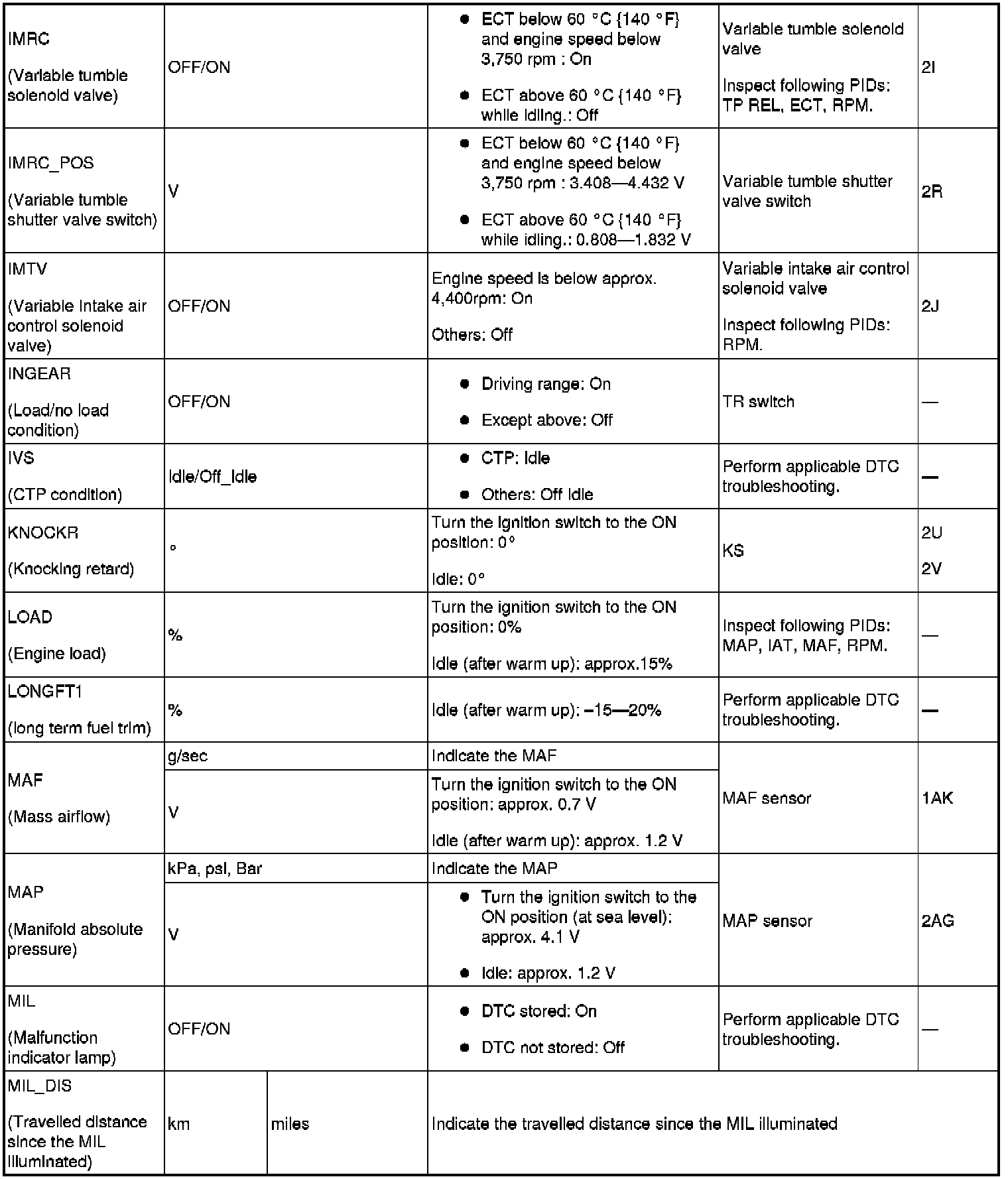 - Refer to PID monitor table for confirm the engine control system operation status while the PCM does not store the DTC. (See Component Tests and General Diagnostics)
