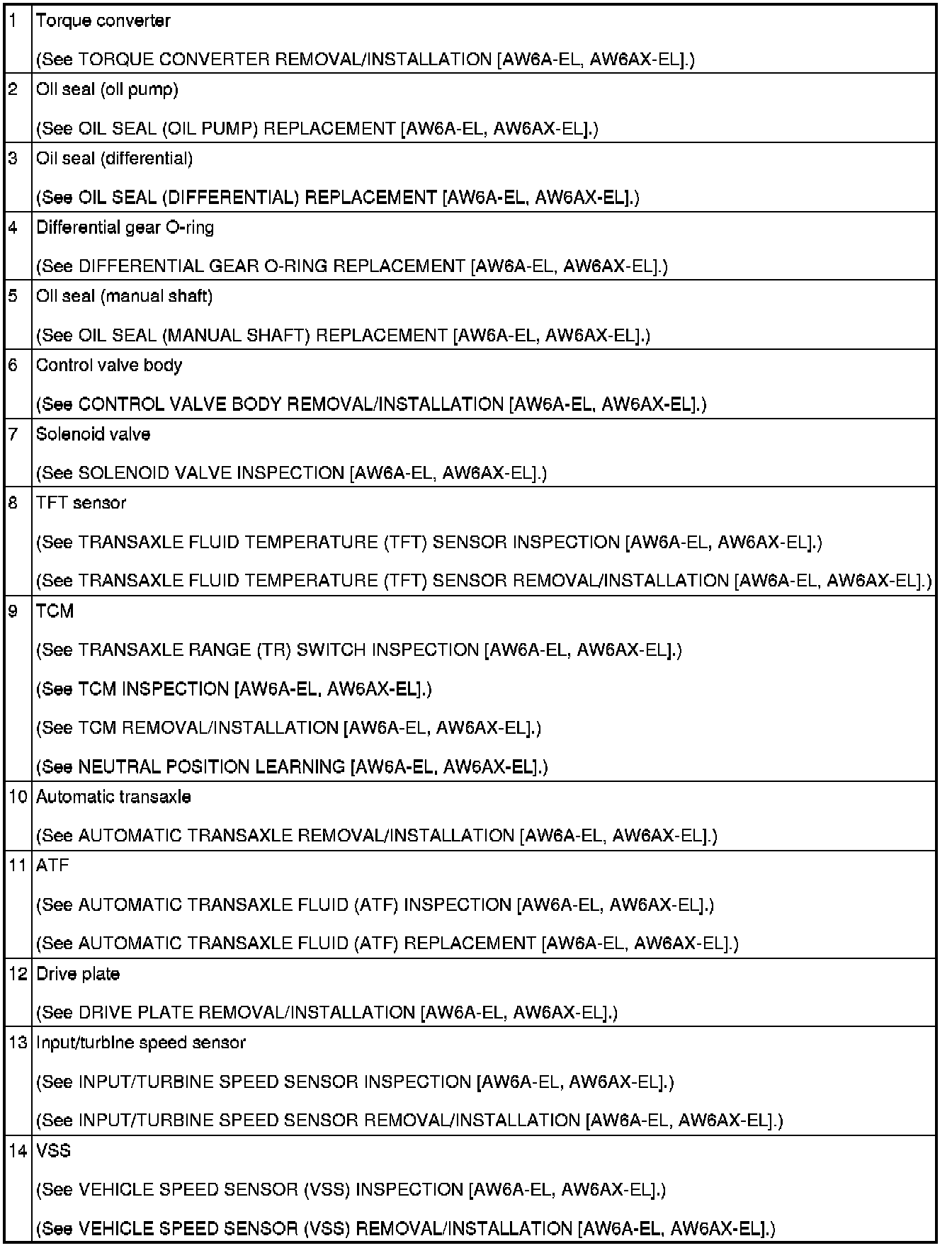 AUTOMATIC TRANSAXLE LOCATION INDEX [AW6A-EL, AW6AX-EL]