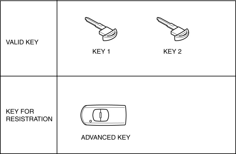 - The "Valid key" or "Valid advanced key" referred to in this information indicates the key that can start the engine.