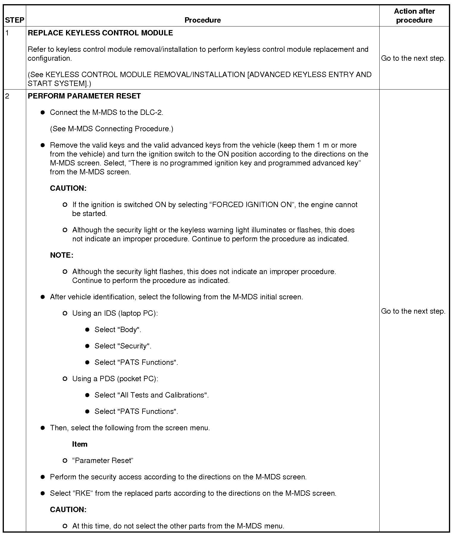 - When replacing the keyless control module or the steering lock unit, remove the valid keys and the valid advanced keys from the vehicle (keep them 1 m or more from the vehicle) and turn the ignition switch to the ON position according to the directions on the M-MDS screen. Select, "There is no programmed ignition key and programmed advanced key" from the M-MDS screen.