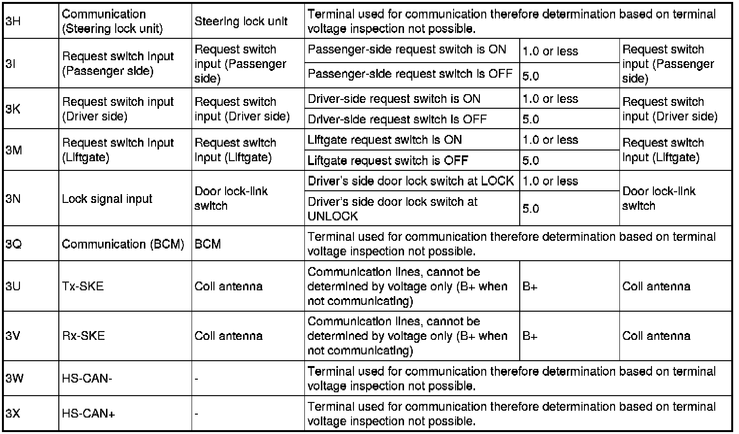 - If the voltage is not as specified in the Terminal Voltage Table (Reference), inspect the parts under "Inspection item(s)" and related wiring harnesses.
