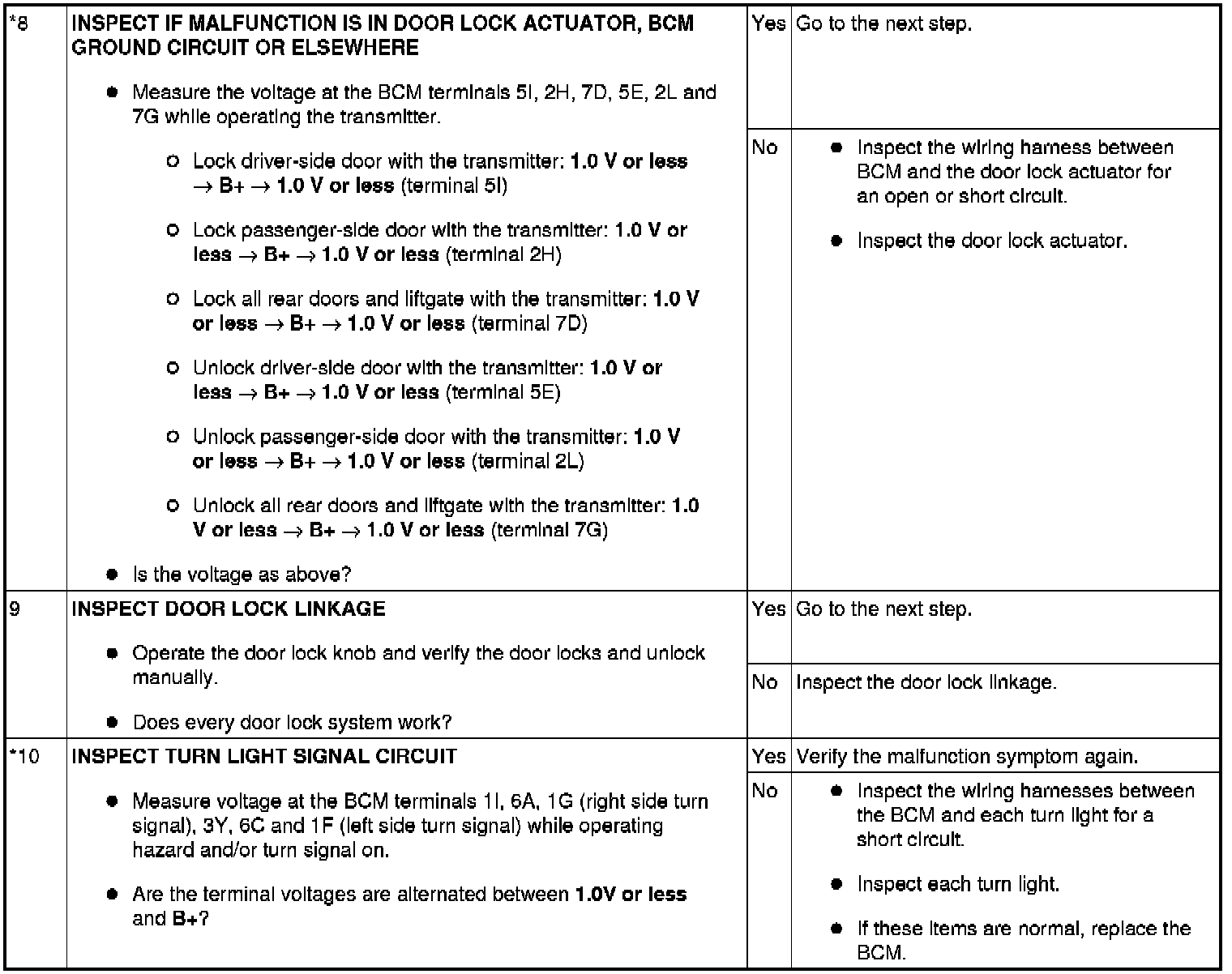 - When performing an asterisked (*) troubleshooting inspection, slightly shake the wiring harness and connectors while performing the inspection to discover whether poor contact points are the cause of any intermittent malfunctions. If there is a problem, verify that the connectors, terminals and wiring harnesses are connected correctly and undamaged.