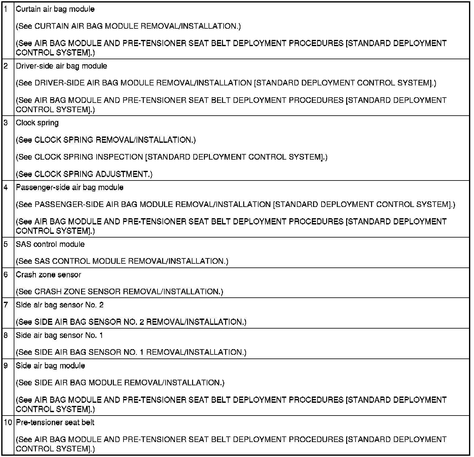 AIR BAG SYSTEM LOCATION INDEX [STANDARD DEPLOYMENT CONTROL SYSTEM]