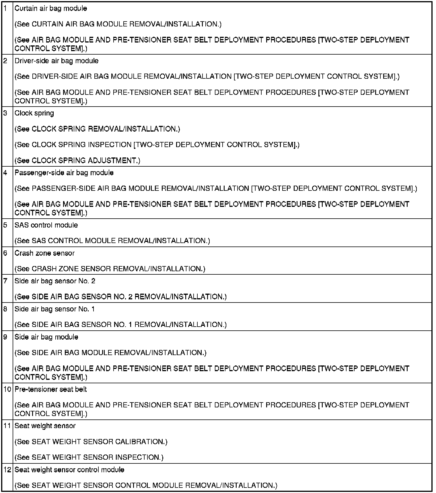 AIR BAG SYSTEM LOCATION INDEX [TWO-STEP DEPLOYMENT CONTROL SYSTEM]