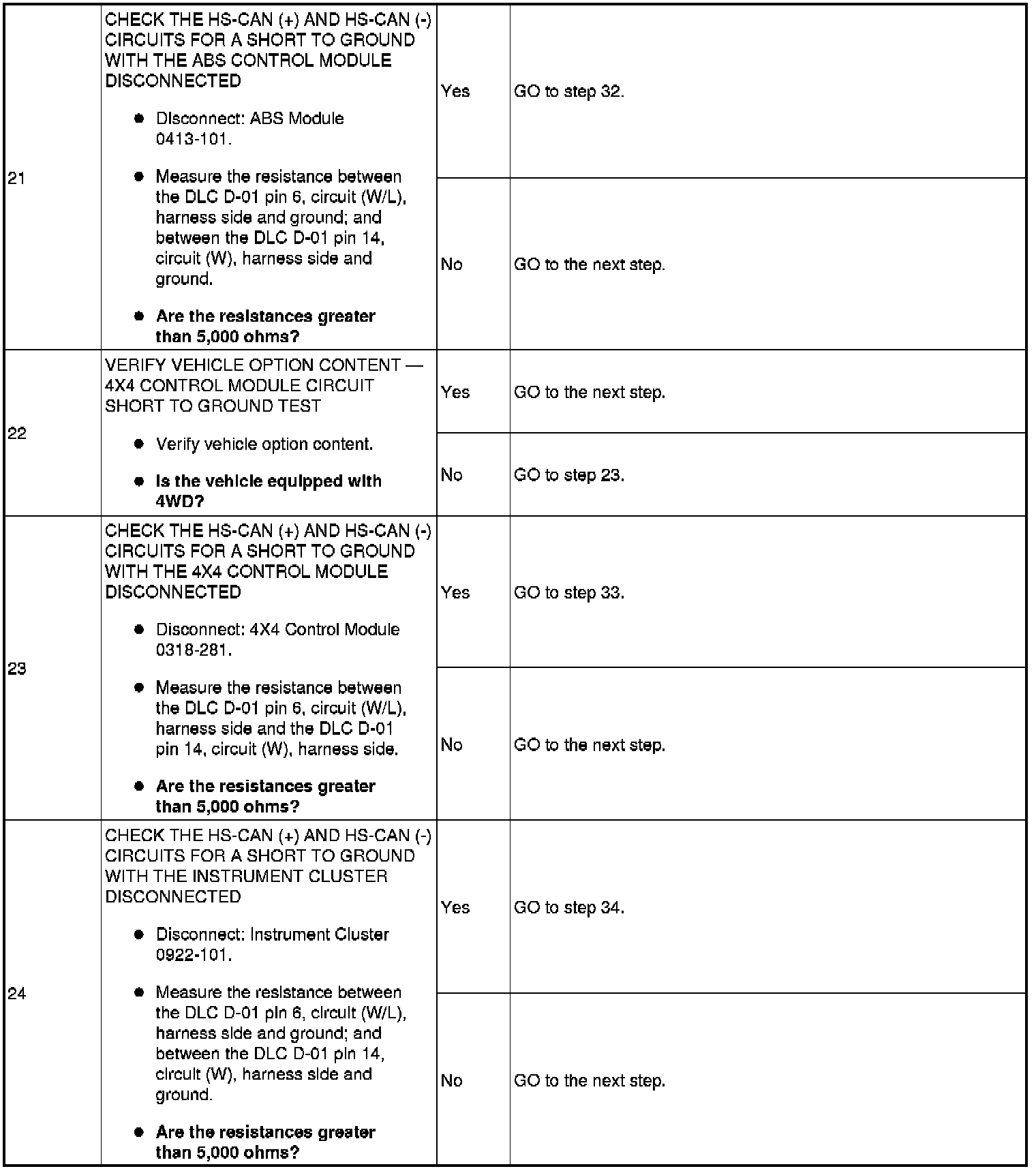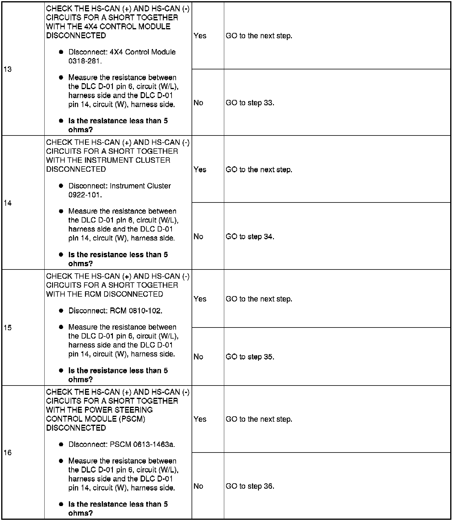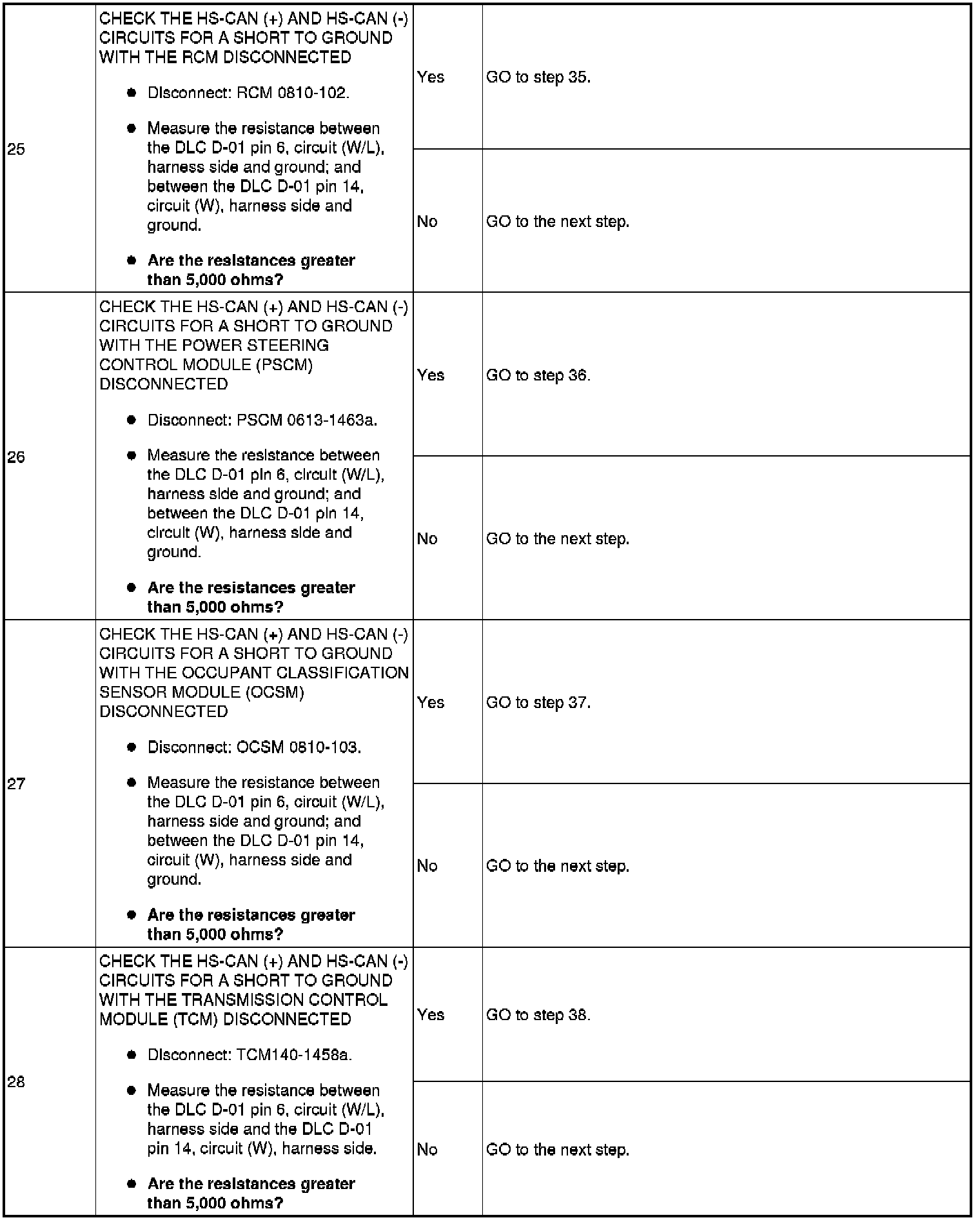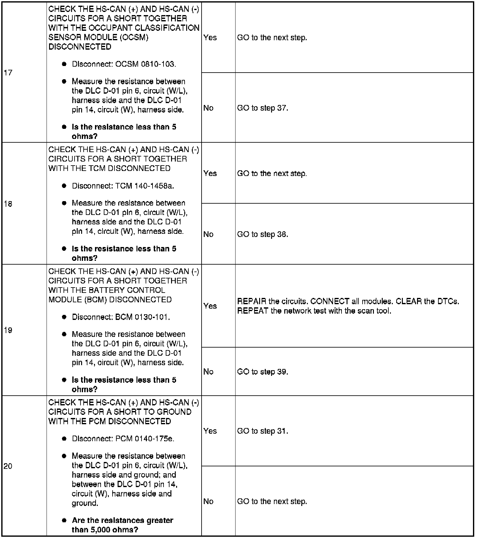 The PCM communicates with the scan tool through the high speed controller area network (HS-CAN). Circuits (W/L) (HS-CAN +) and (W) (HS-CAN -) provide the network connection to the PCM. The PCM shares the HS-CAN with the ABS module, restraints control module (RCM), occupant classification sensor module (OCSM), power steering control module (PSCM), transmission control module (TCM), battery control module (BCM) and the instrument cluster (IC). Voltage for the PCM is provided by circuits (GY/V) and (GY/R). Circuit (B) provides ground.