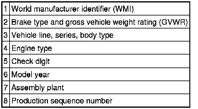 The fourth VIN position is the vehicle brake type and GVWR code, all vehicles use hydraulic brakes and driver and front passenger air bags.