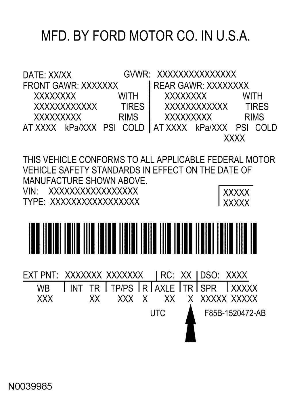 The upper portion of the Vehicle Certification (VC) label contains the manufacturer's name, the month and year of manufacture, the certification statement and the VIN. It also includes Gross Vehicle Weight Rating (GVWR). The VC label is located on the left-hand door jamb. The serial number can also be found on the engine block, transmission and frame.If a vehicle requires replacement of the VC label and is 4 years old or less, an authorized dealer must submit the VIN to their respective regional office. The regional office will submit a web form to the assembly plant for the replacement label. Once the label has been printed, a representative from the regional office will deliver the label to the dealer and witness installation on the vehicle. If a vehicle is more than 4 years old and requires a replacement label, the dealer must submit a request to the Department of Motor Vehicles.