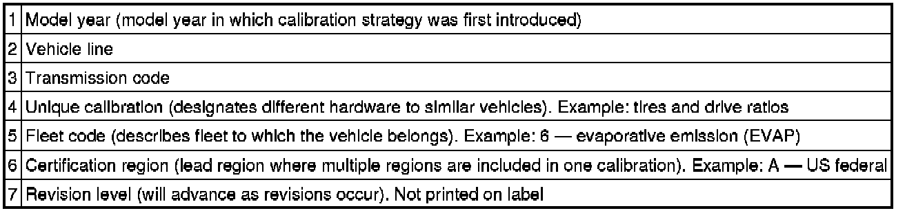 NOTE:Powertrain calibration information is limited to a maximum of 5 characters per line on the vehicle certification (VC) label. Because of this, calibration identification consisting of more than 5 characters will wrap to the second line on the VC label.