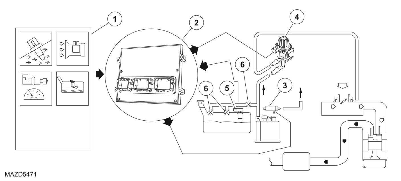 The enhanced EVAP system consists of a fuel tank, fuel filler cap, fuel tank mounted or in-line fuel vapor control valve, fuel vapor vent valve, EVAP canister, fuel tank mounted or fuel pump mounted or in-line fuel tank pressure (FTP) sensor, EVAP canister purge valve or vapor management valve (VMV), intake manifold hose assembly, EVAP canister vent (CV) solenoid, PCM and connecting wires, and fuel vapor hoses. The enhanced EVAP system, including all the fuel vapor hoses, can be checked when a leak is detected by the PCM.