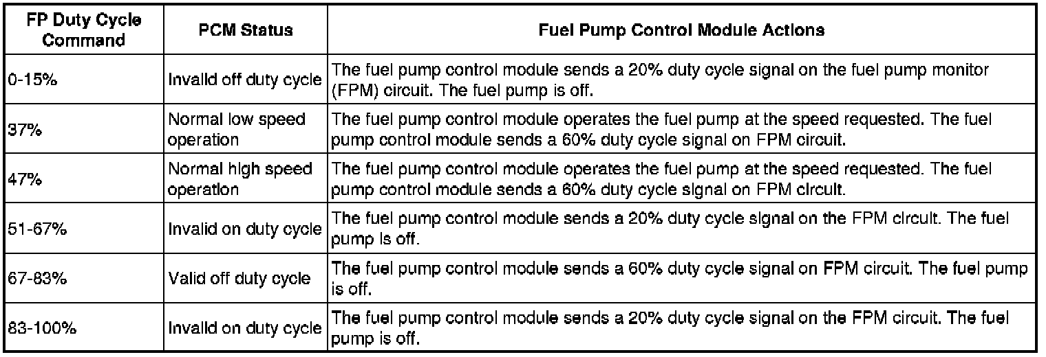 The fuel pump control module communicates diagnostic information to the PCM through the FPM circuit. This information is sent by the fuel pump control module as a duty cycle signal. The 4 duty cycle signals that may be sent are listed in the following table.Fuel Pump Driver Module Duty Cycle Signals
