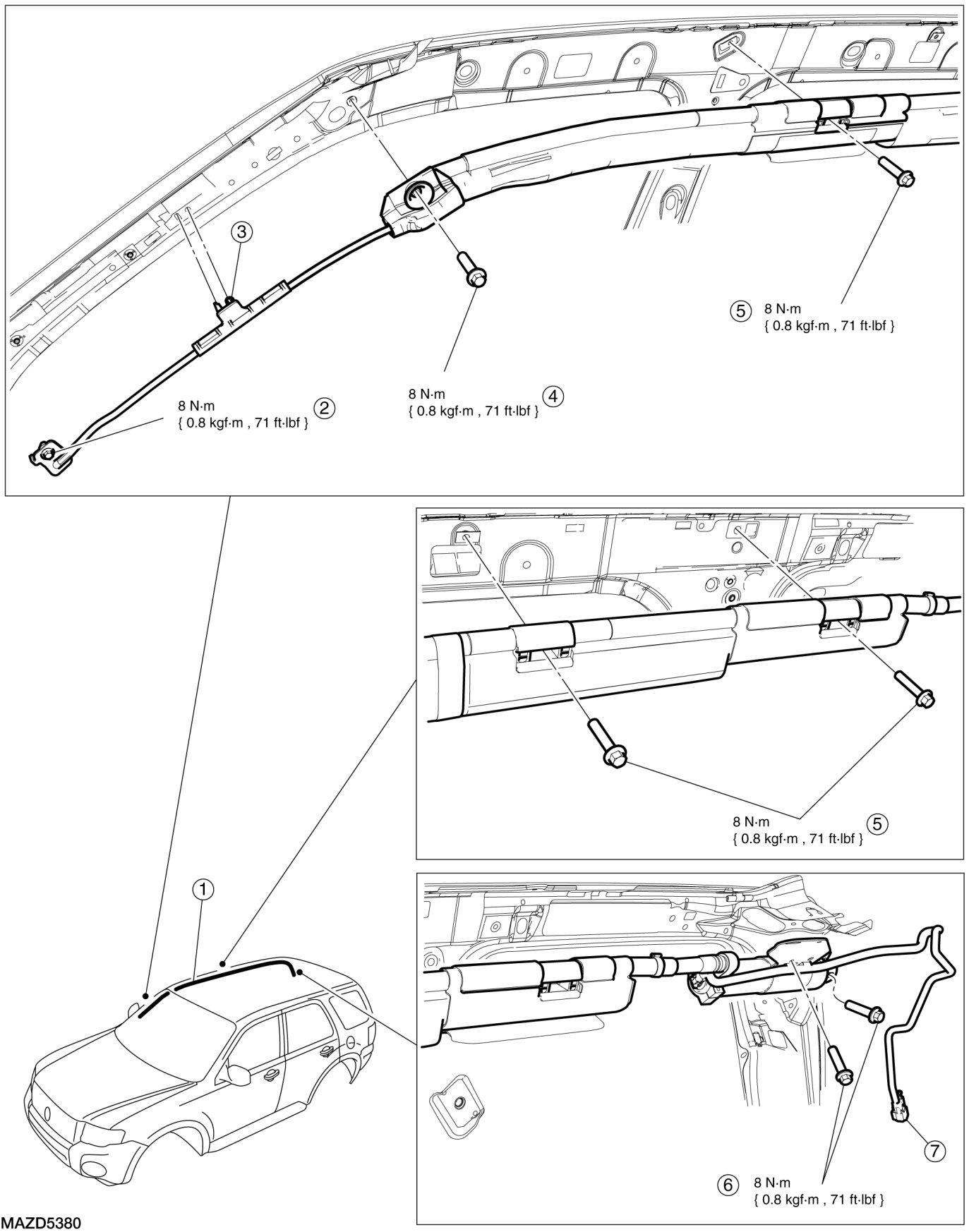 - Tighten to 8 Nm {0.8 kgf-m, 71 in-lbf}.