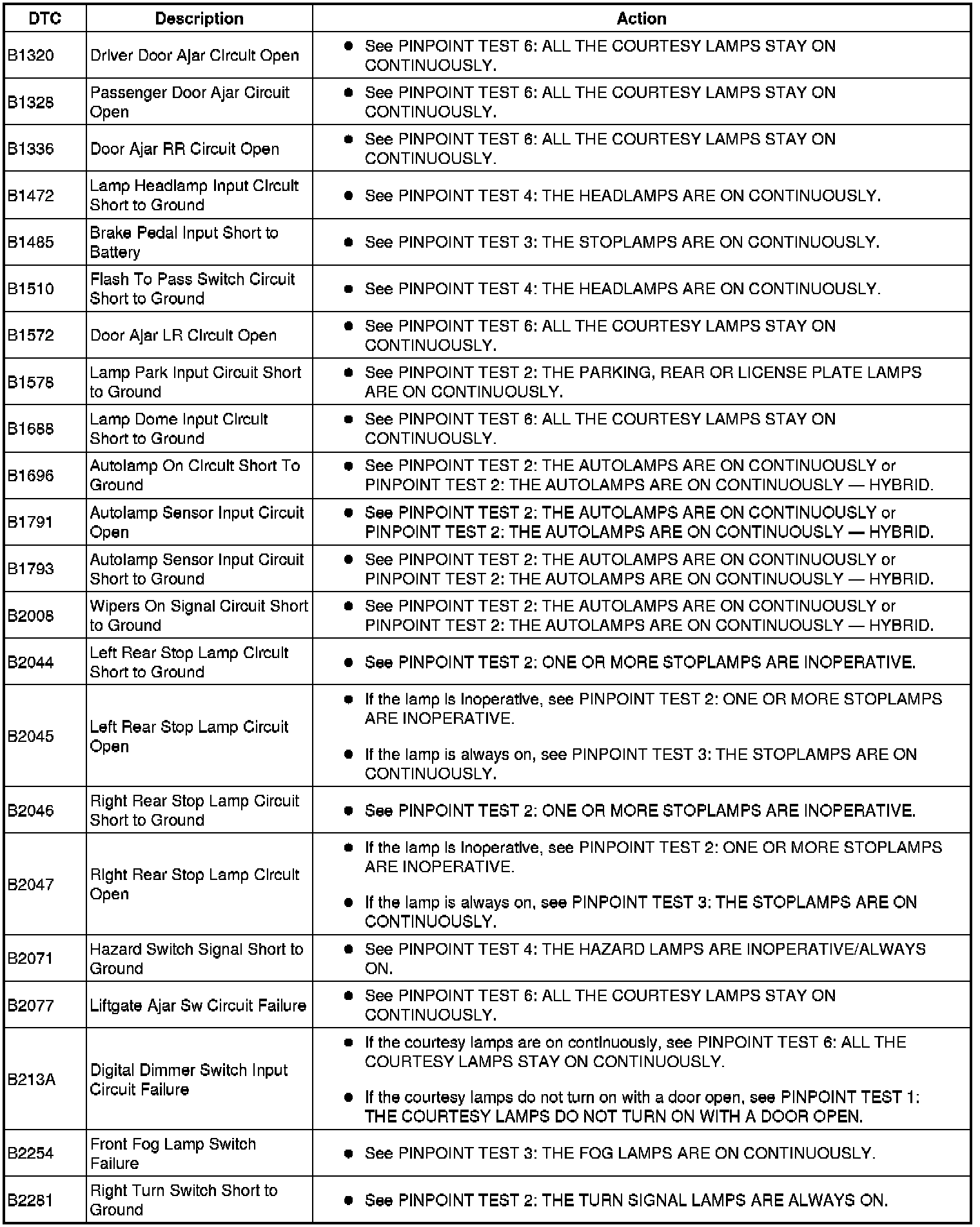 Lighting Systems - Diagnostic Trouble Code (DTC) Chart - Lighting Systems