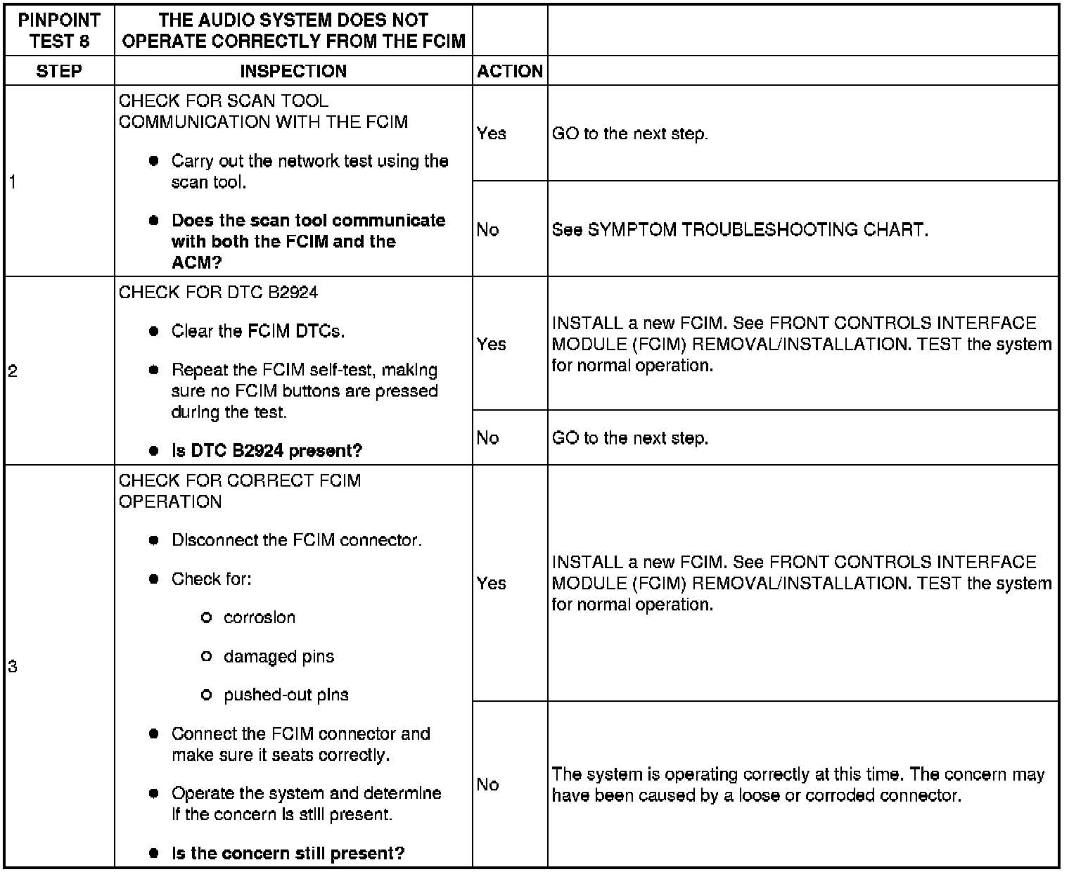 PINPOINT TEST 8: THE AUDIO SYSTEM DOES NOT OPERATE CORRECTLY FROM THE FRONT CONTROLS INTERFACE MODULE (FCIM)