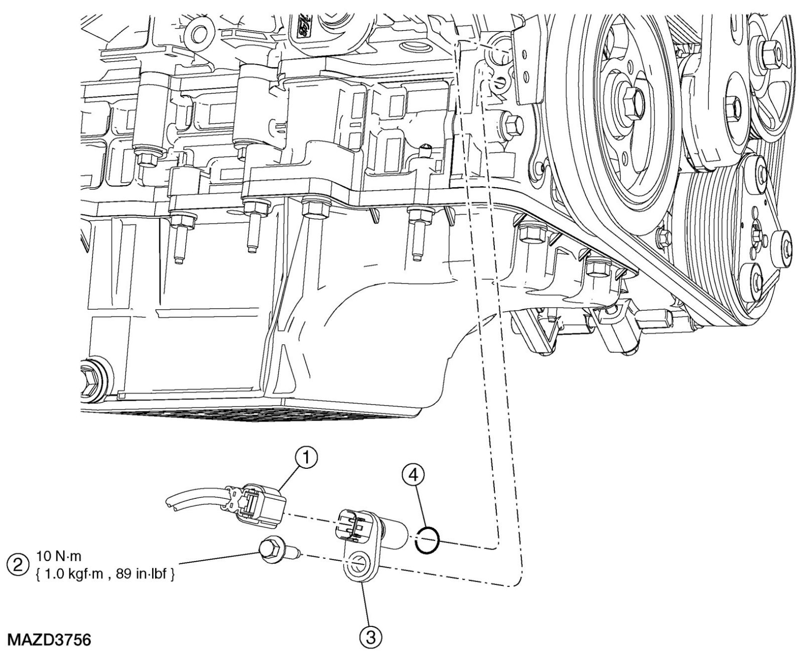 - To install, tighten to 10 Nm {1.0 kgf-m, 89 in-lbf}.