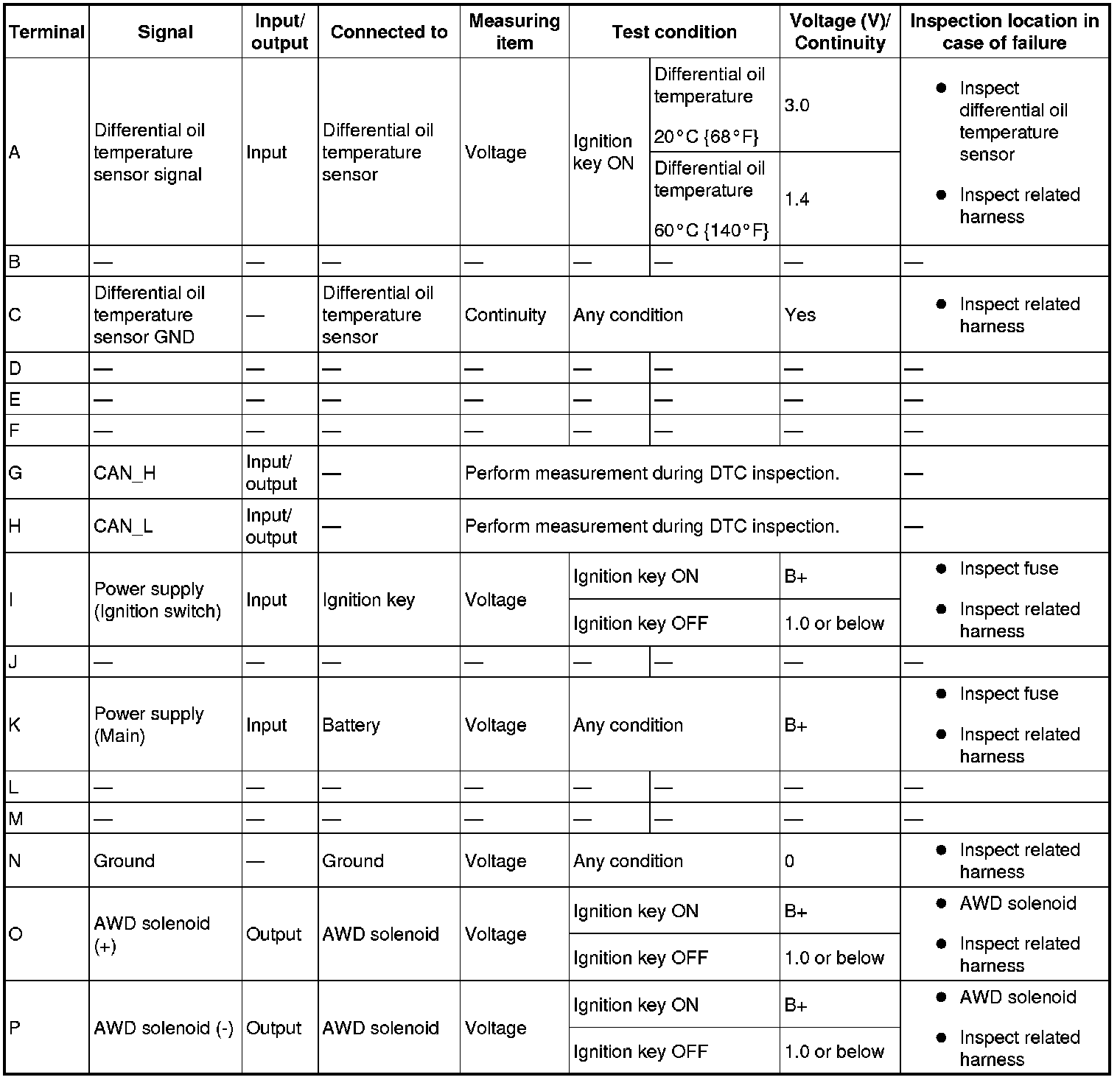 - AWD CM terminal voltage can vary depending on measuring conditions and vehicle aging, resulting in misdiagnosis. Therefore, it is necessary to perform an overall inspection of the input/output systems and AWD CM to determine which part is malfunctioning.