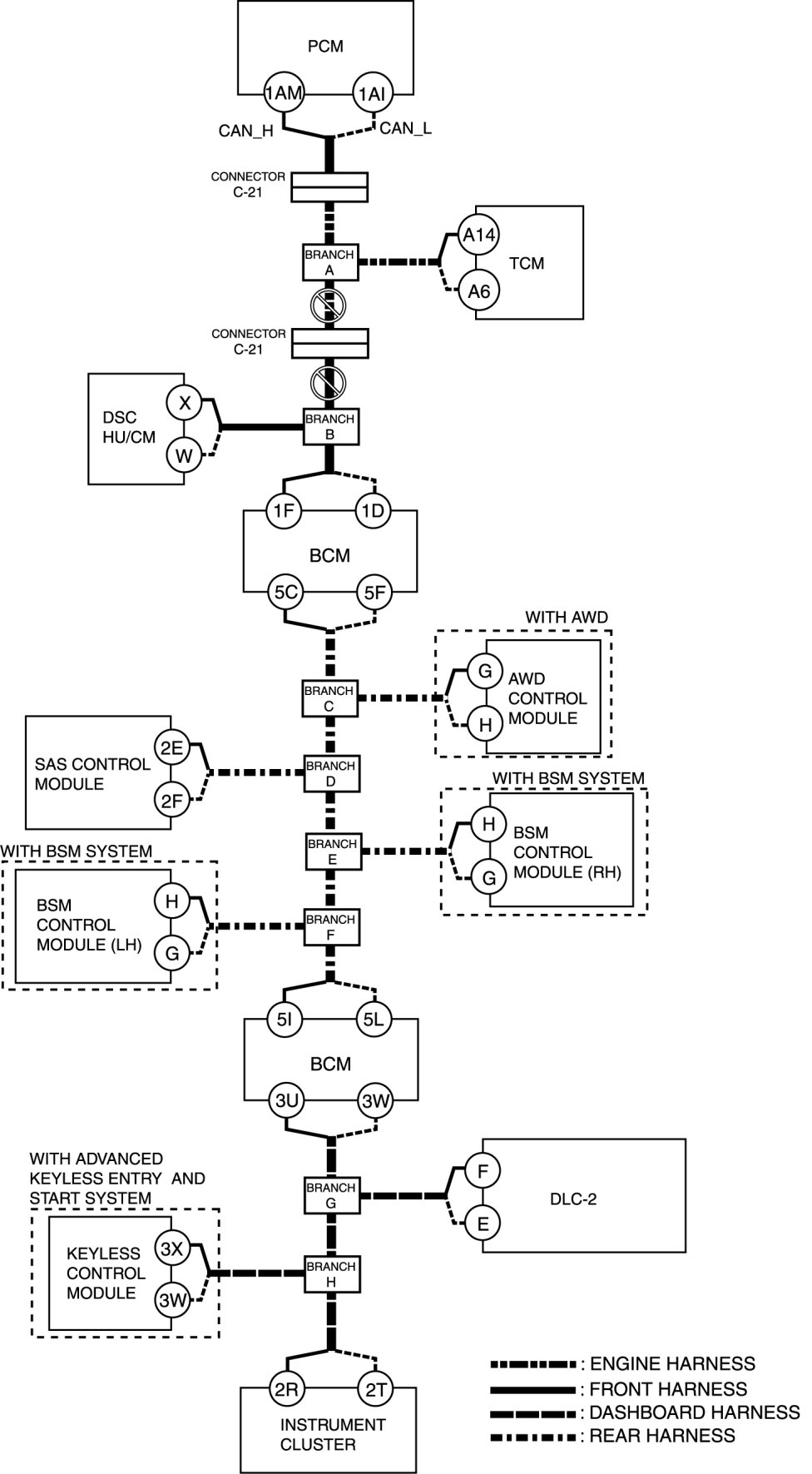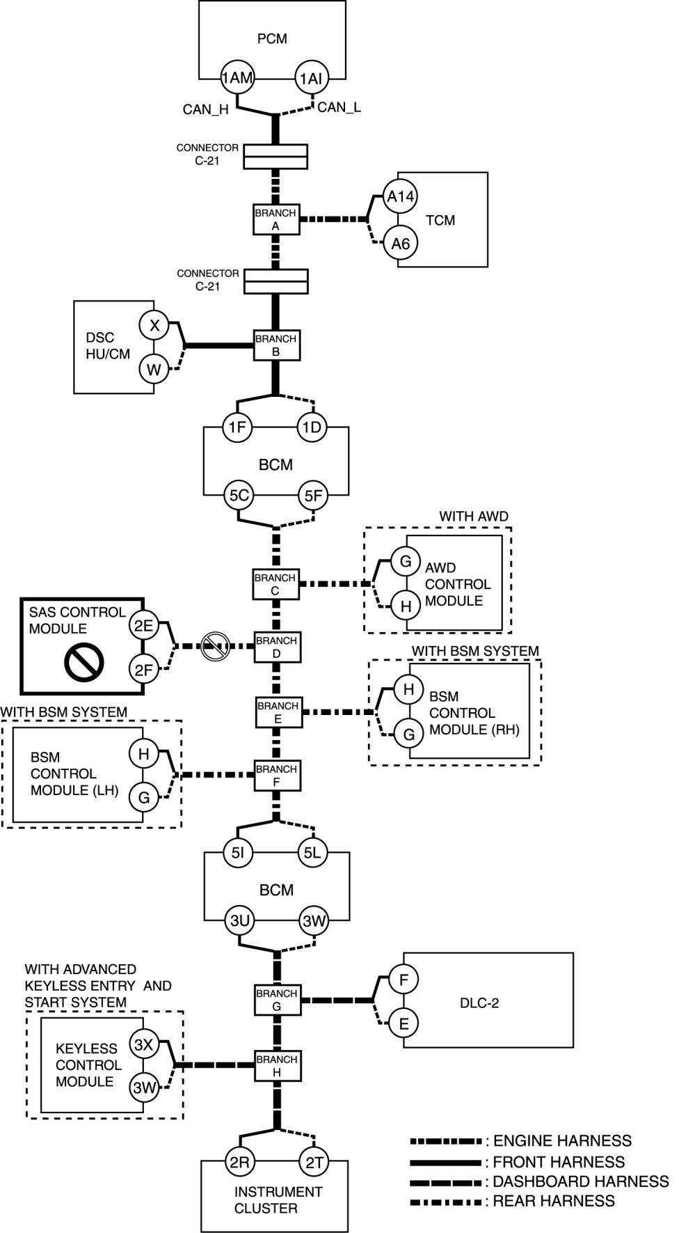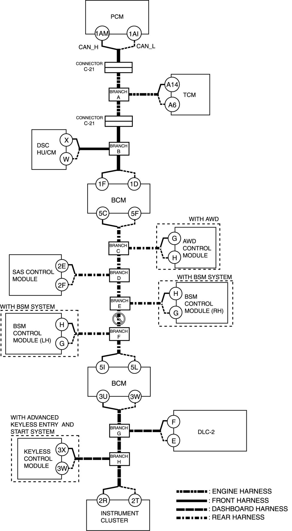 - Wiring harness between DSC HU/CM terminal W and branch B