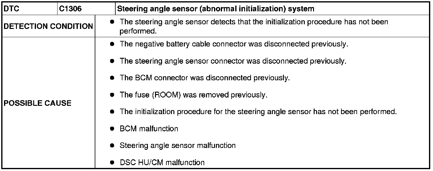 - The steering angle initialization value of the BCM is stored using the battery power supply. Therefore, the battery power supply of the BCM is cut and the stored steering angle initialization value is cleared when any of the following items are performed. DTC C1306 is stored in the memory.