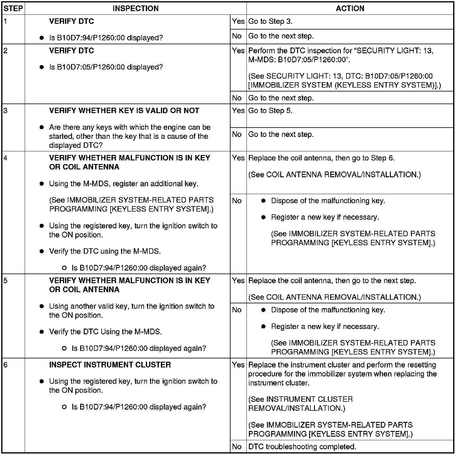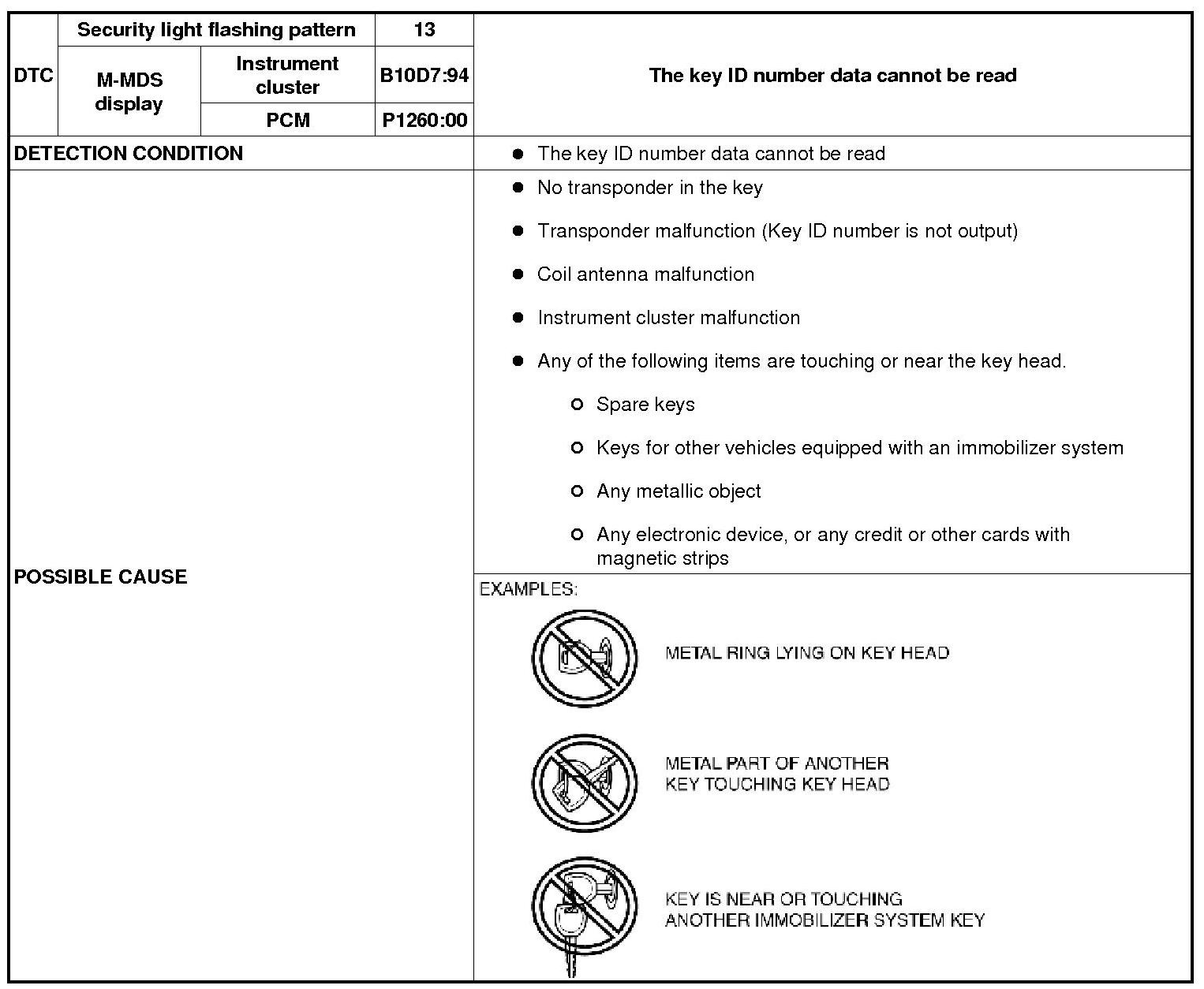 SECURITY LIGHT: 13, DTC: B10D7:94/P1260:00 [IMMOBILIZER SYSTEM (KEYLESS ENTRY SYSTEM)]