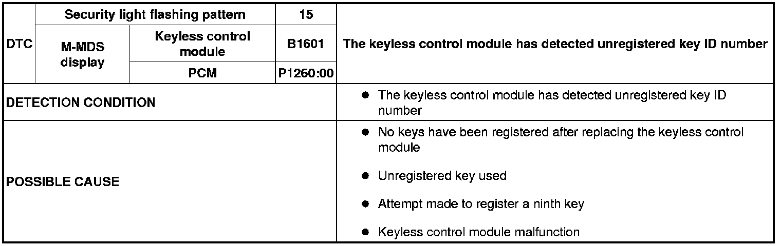 SECURITY LIGHT: 15, DTC: B1601/P1260:00 [IMMOBILIZER SYSTEM (ADVANCED KEYLESS ENTRY AND START SYSTEM)]