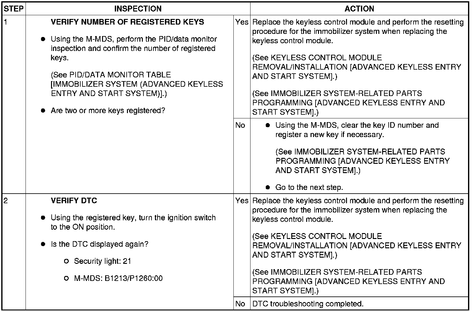 SECURITY LIGHT: 21, DTC: B1213/P1260:00 [IMMOBILIZER SYSTEM (ADVANCED KEYLESS ENTRY AND START SYSTEM)]