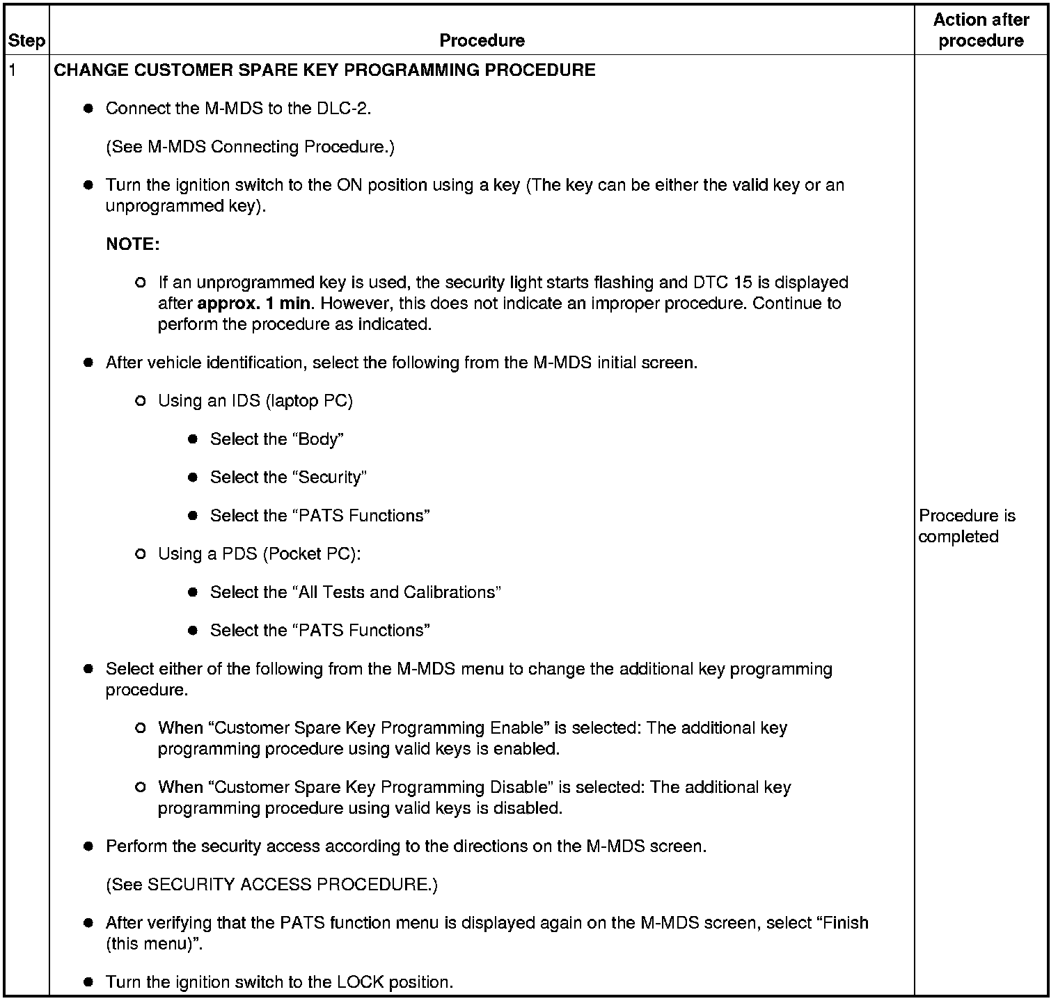 Immobilizer System-Related Parts Service and Programming Procedure Table