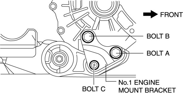 3. Temporarily install the No.1 engine mount bracket bolt C in the figure.