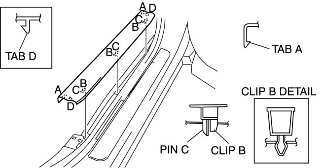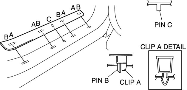 1. Pull the front scuff plate outer upward, detach clips A, pins B and C from the body, and then remove the front scuff plate outer.