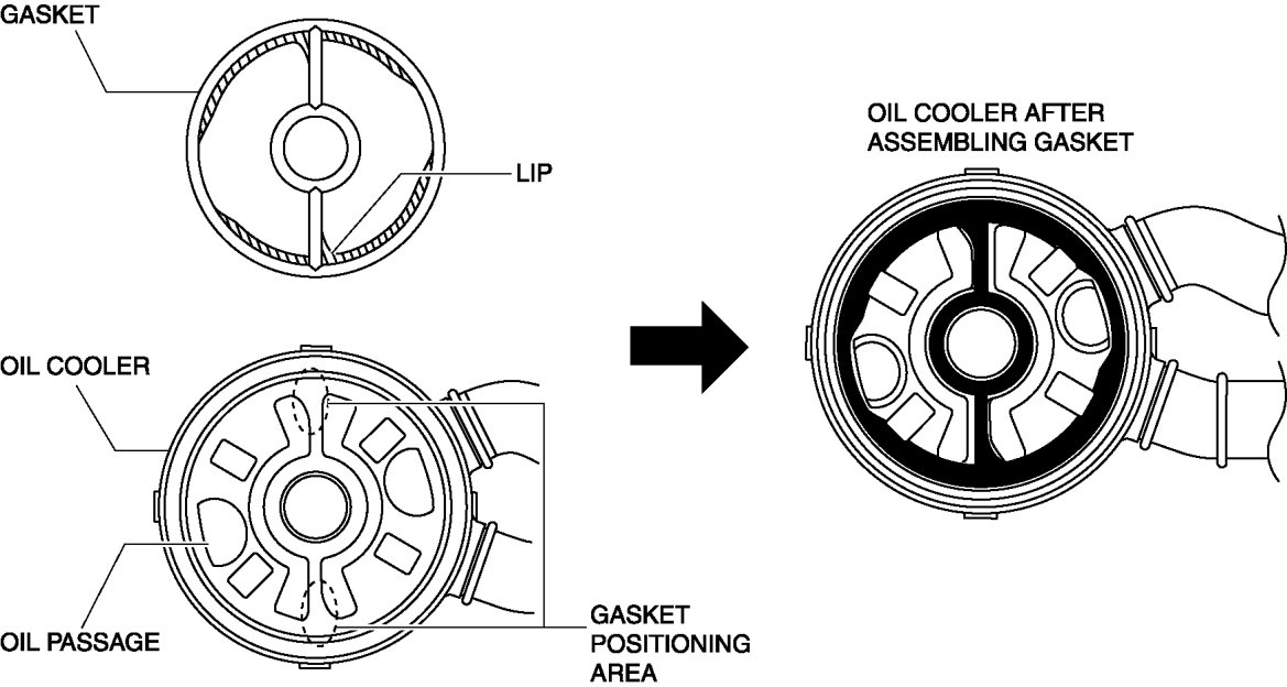 - Assemble the gasket to the correct position using the following procedure so that the gasket lip does not overlap the oil passage for the oil cooler. Otherwise, it could leak engine oil and damage the engine.