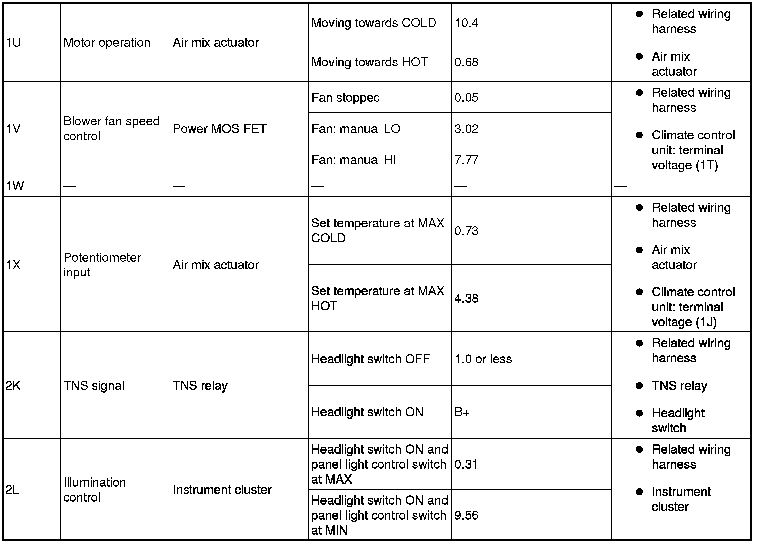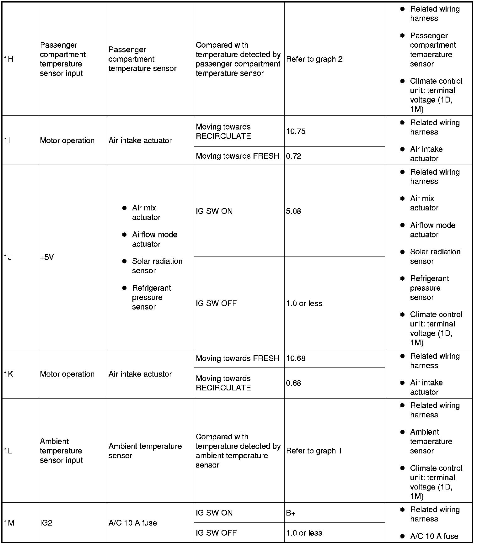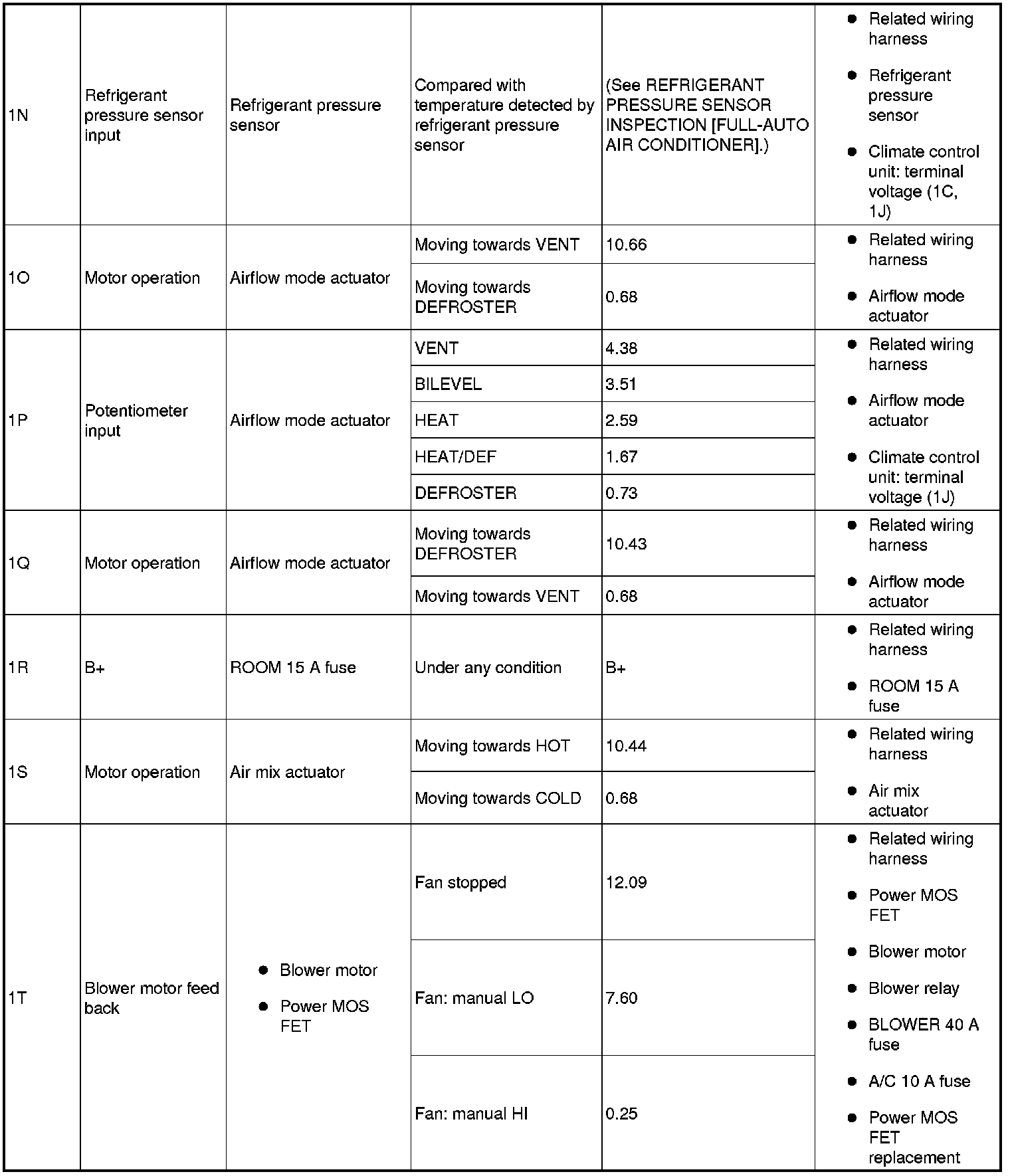 - If the parts under "Inspection item (s)" are found to be normal (except for terminal 1T), replace the climate control unit.