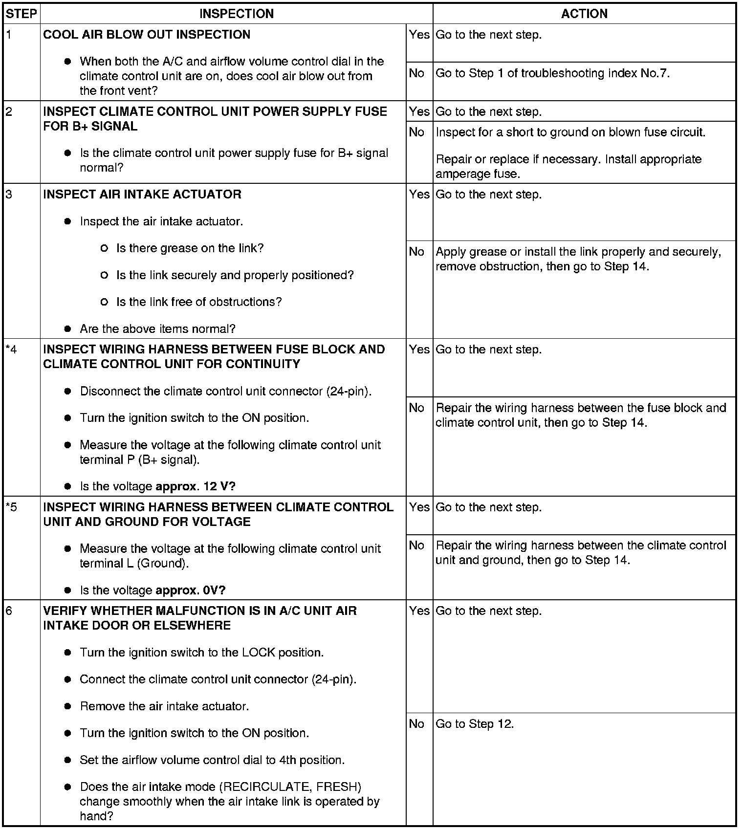 - When performing an asterisked (*) troubleshooting inspection, shake the wiring harness and connectors while doing the inspection to discover whether poor contact points are the cause of any intermittent malfunctions. If there is a problem, inspect to make sure connectors, terminals and wiring harness are connected correctly and undamaged.