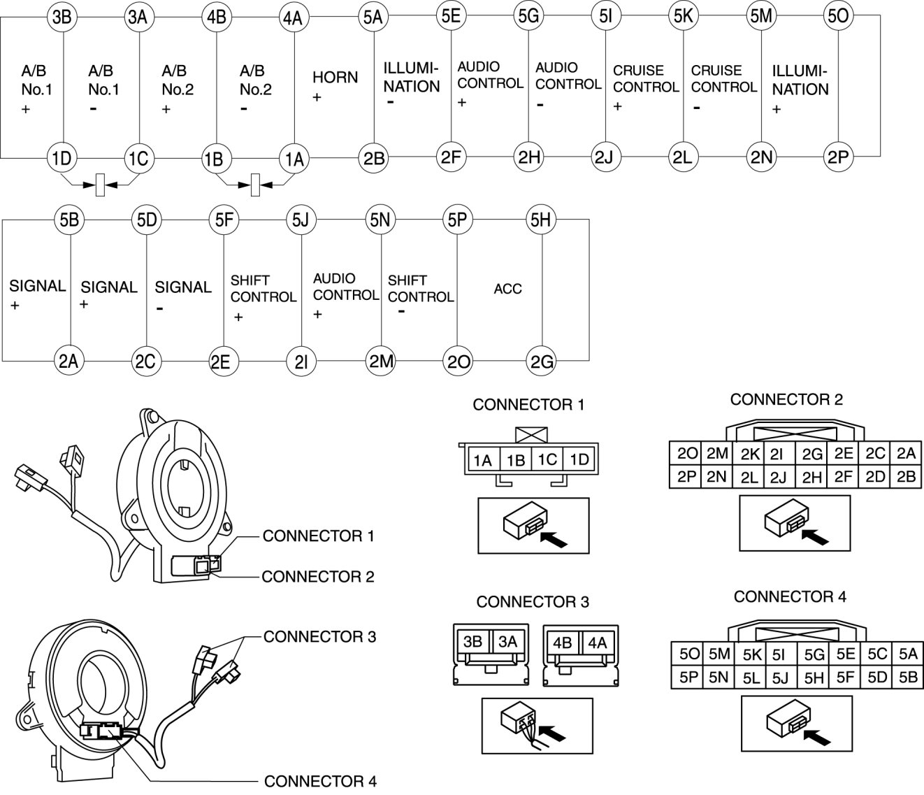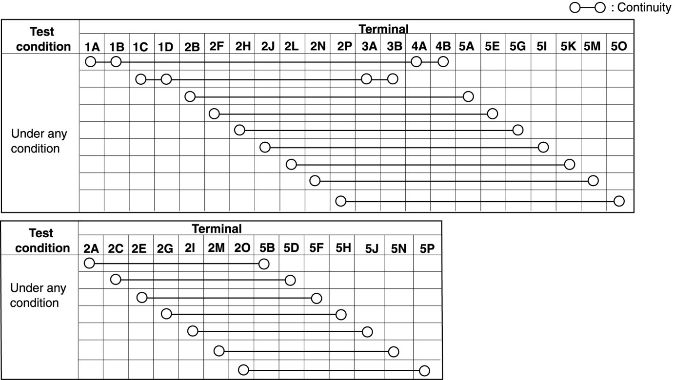 - When the vehicle-side connector for the clock spring is disconnected, terminals 1A, 1B, 1C and 1D are shorted to prevent unexpected operation (deployment) of the air bag module.