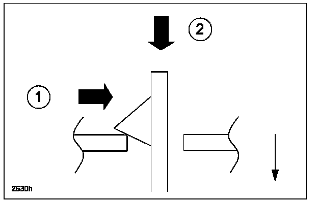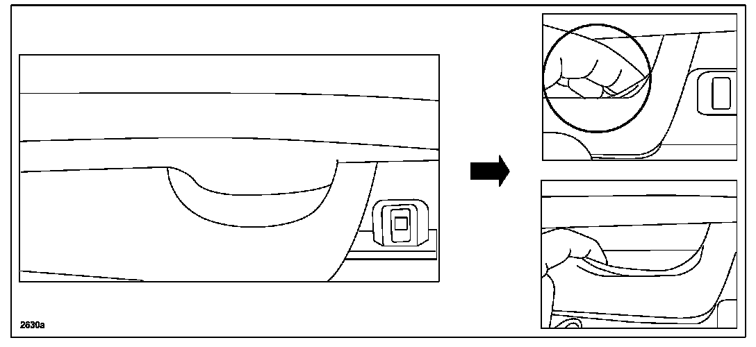 6. Detach tab (1) and push tab (2). Pull the frame to remove it from the door trim.
