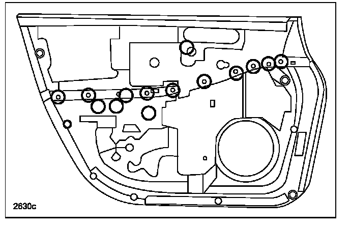 2. Remove the applicable door trim according to the MS3 online instructions or the Workshop Manual (section 09-17 FRONT DOOR TRIM REMOVAL/INSTALLATION or REAR DOOR TRIM REMOVAL/INSTALLATION).