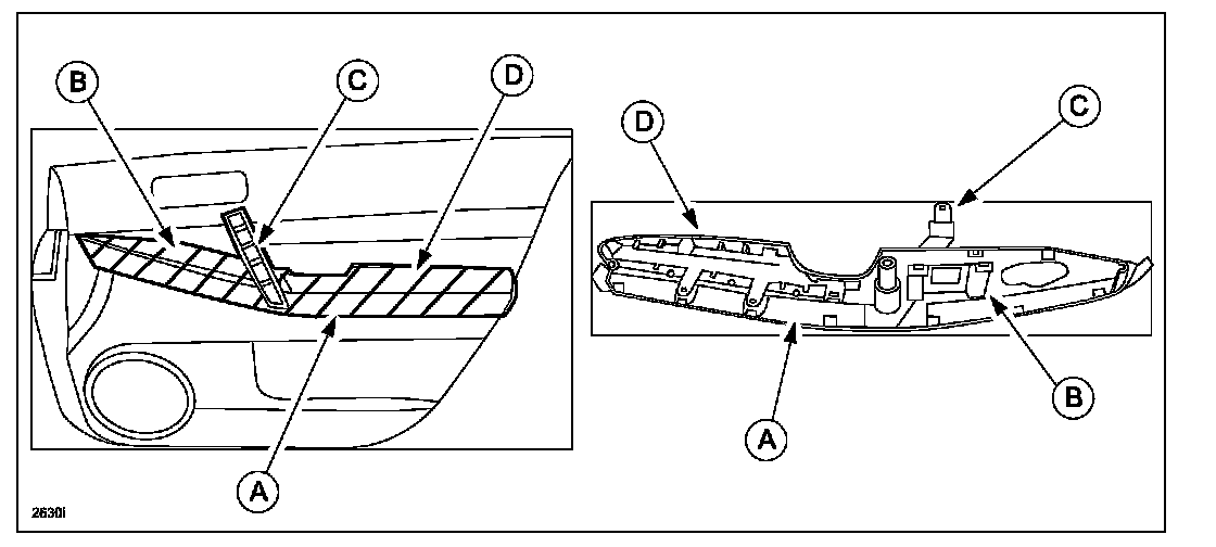 - Remove the decorative frame (A), switch panel (B), arm rest (D) and grip (C) all together.