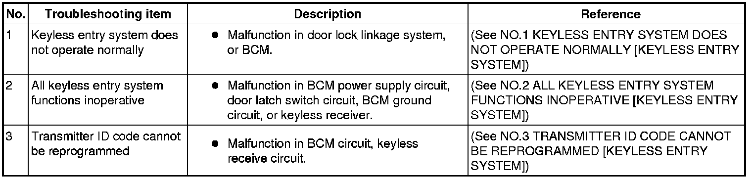 SYMPTOM TROUBLESHOOTING CHART [KEYLESS ENTRY SYSTEM]