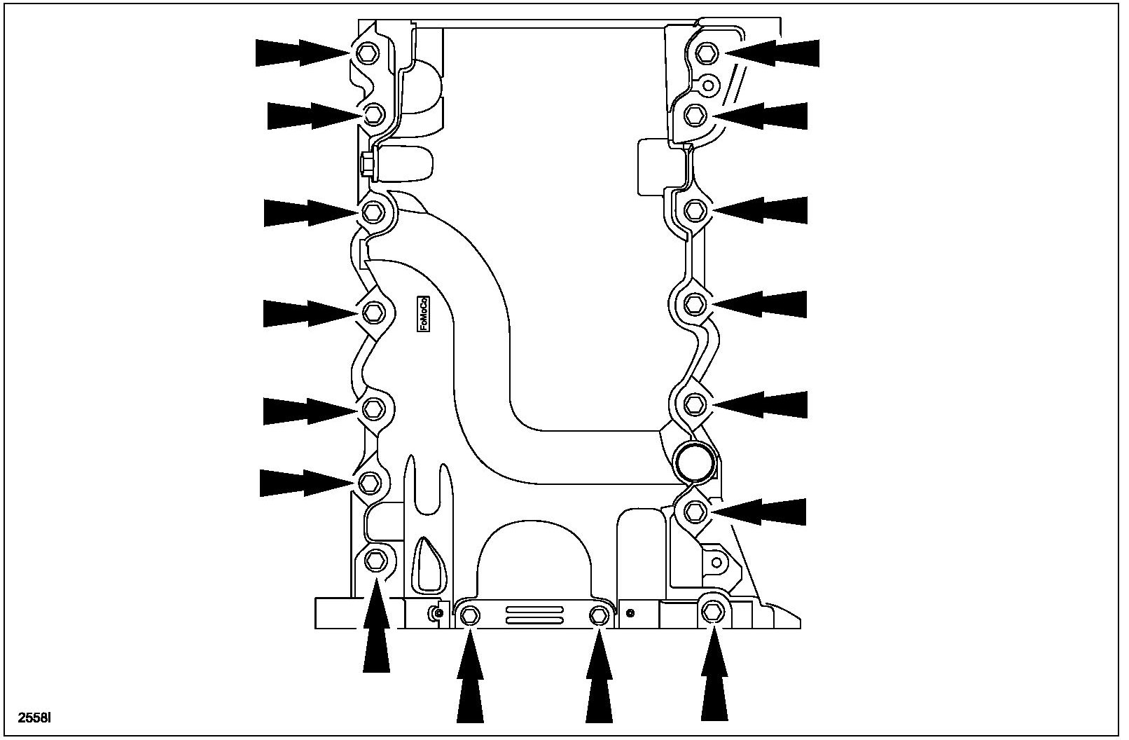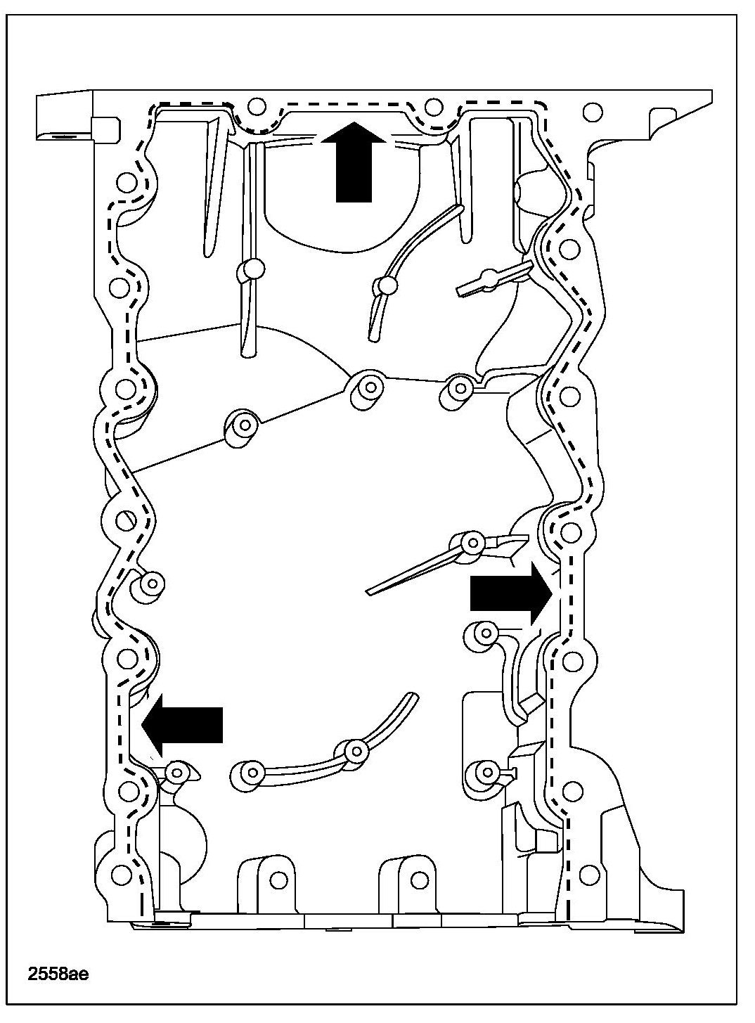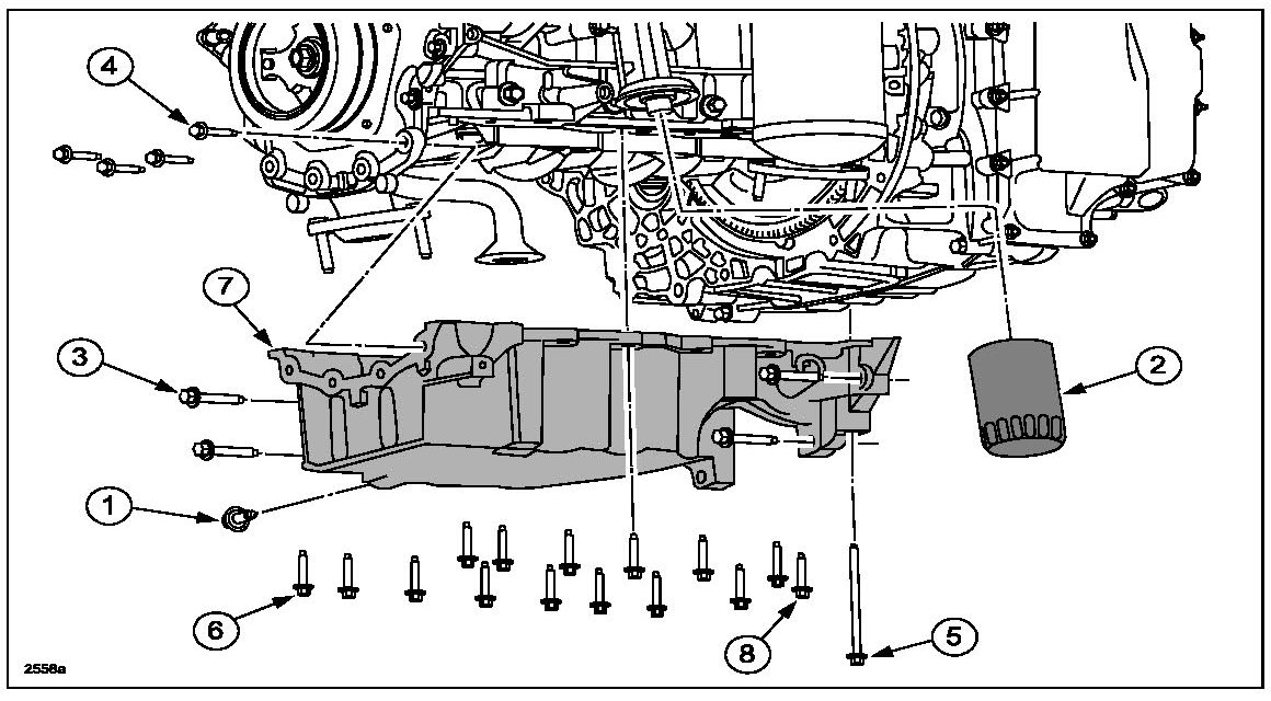- Keep the oil pan as close as possible to the transmission while installing, then slide forward towards the engine front cover to prevent wiping off of the sealant.