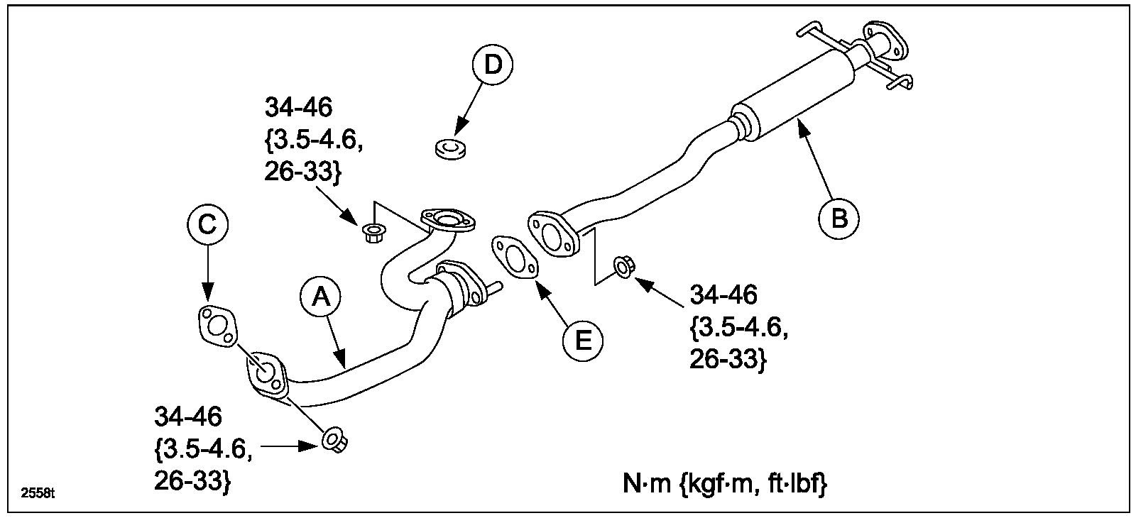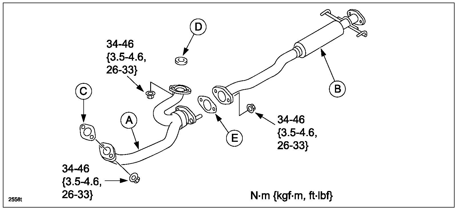 12. Remove the exhaust front pipe (A). Discard (C), (D) and (E) exhaust gaskets.