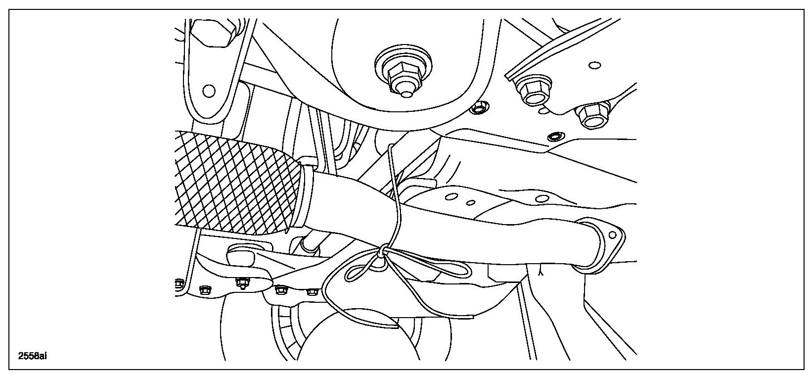 13. Use electrical wire to temporarily support the exhaust middle pipe (B).