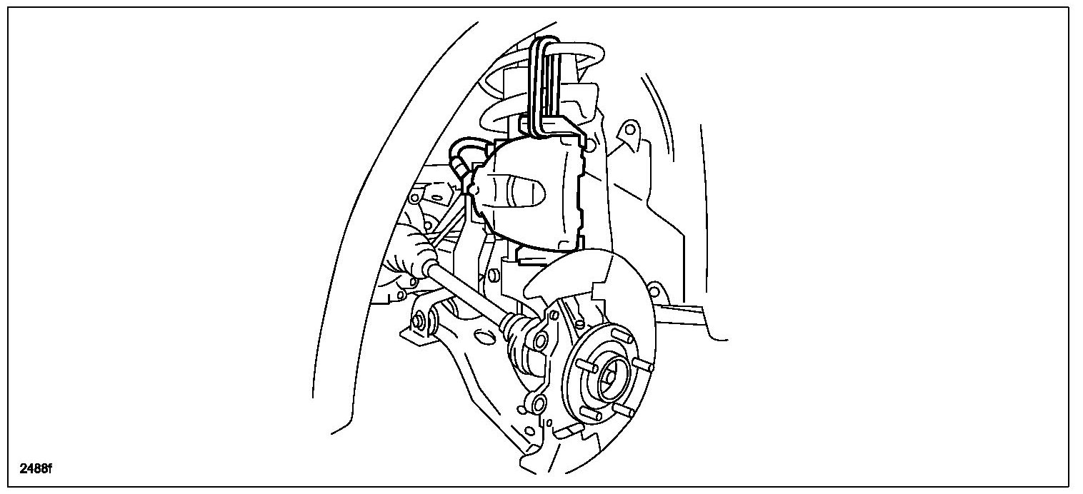 22. Remove the brake caliper component from the steering knuckle and suspend it out of the way using a cable.