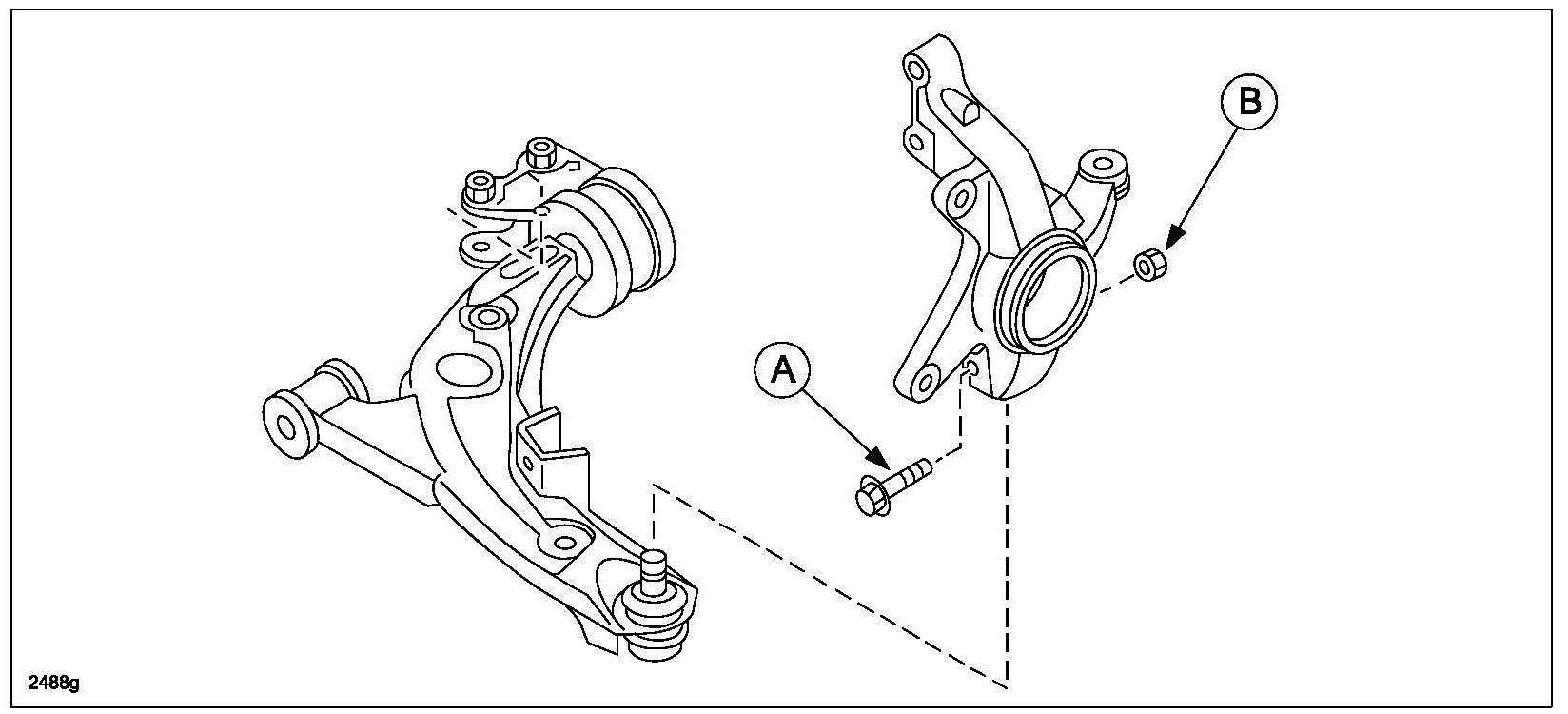 23. Remove the front lower arm ball joint bolt (A) and nut (B). Then separate the lower control arm from the knuckle.
