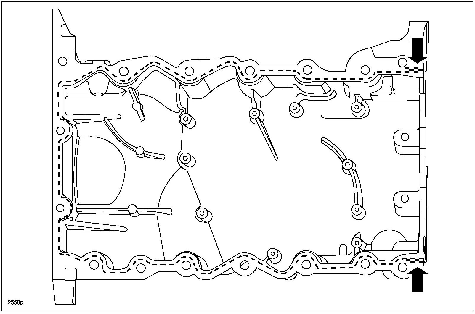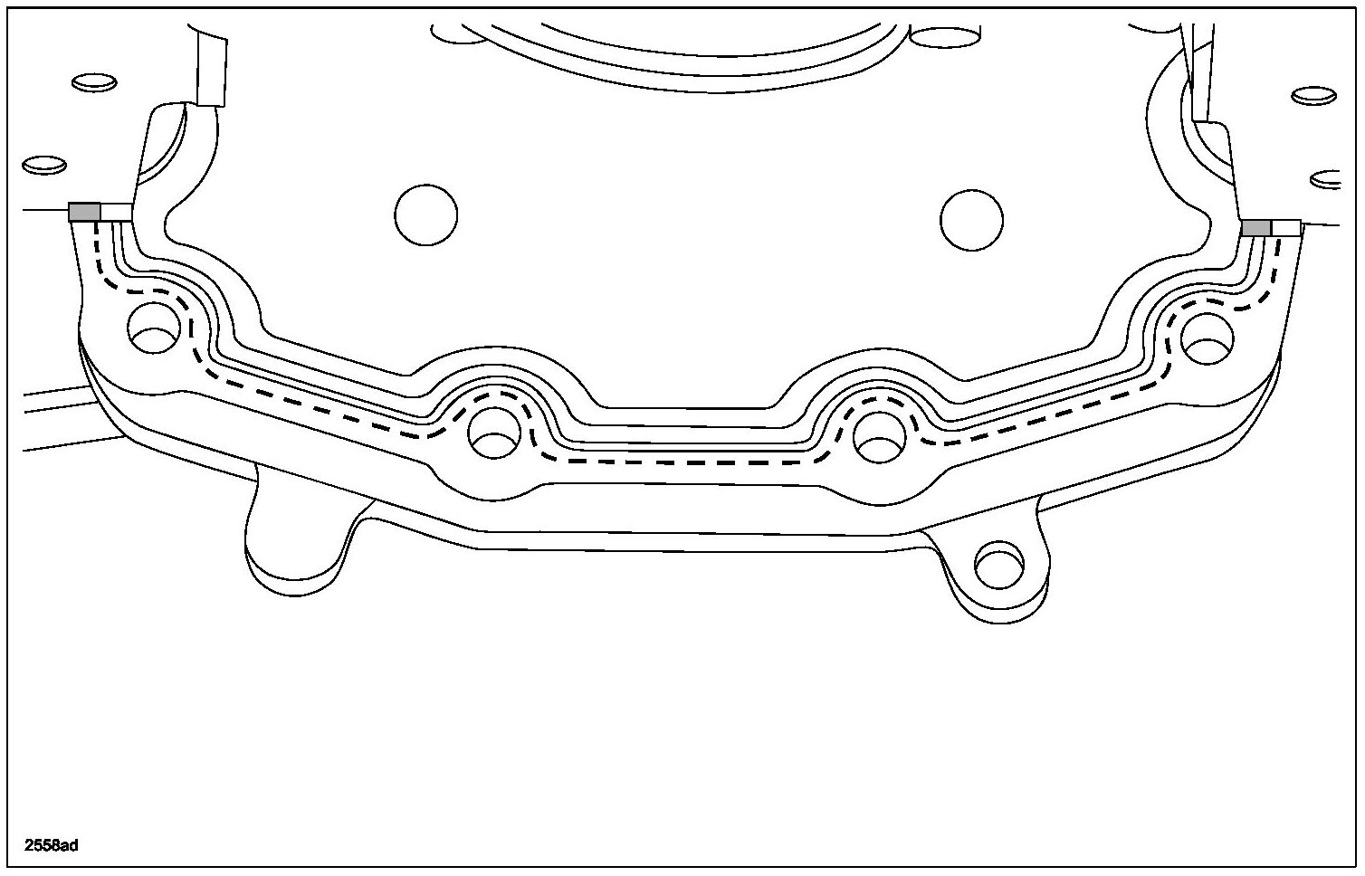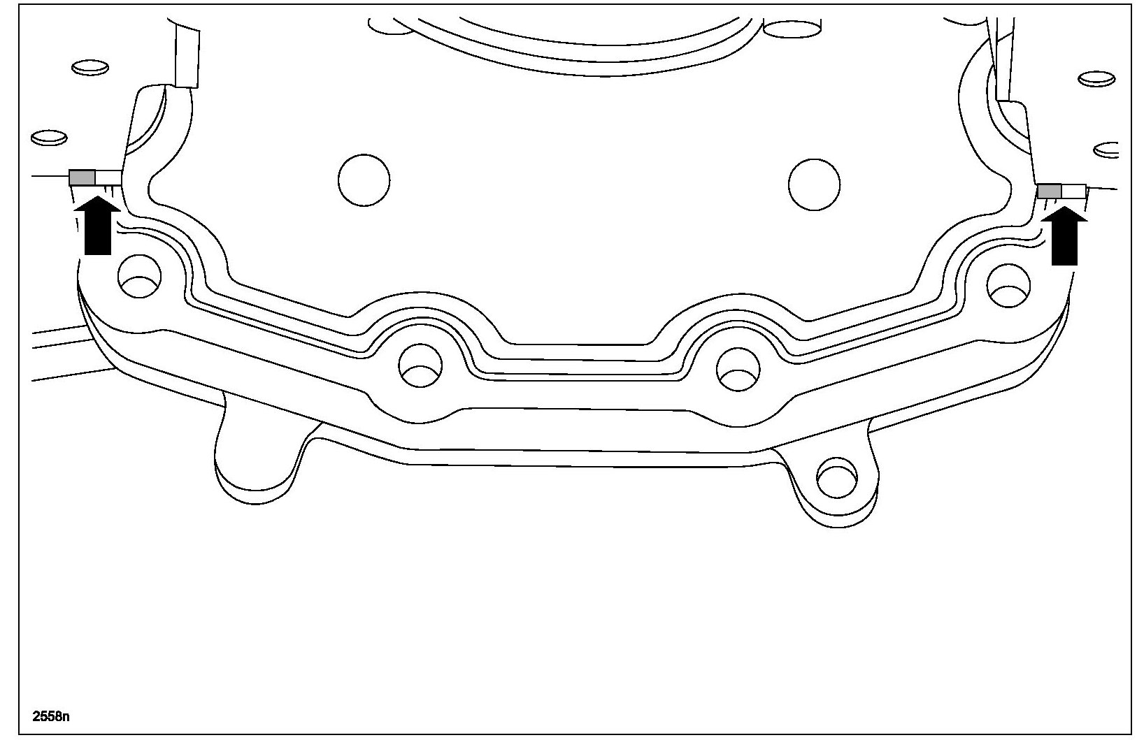 1. Apply a 5.5 mm (0.21 in) bead of Mazda Gray RTV Silicone Gasket Maker to the 2 engine front cover-to-cylinder block joint areas on the sealing surface of the oil pan.