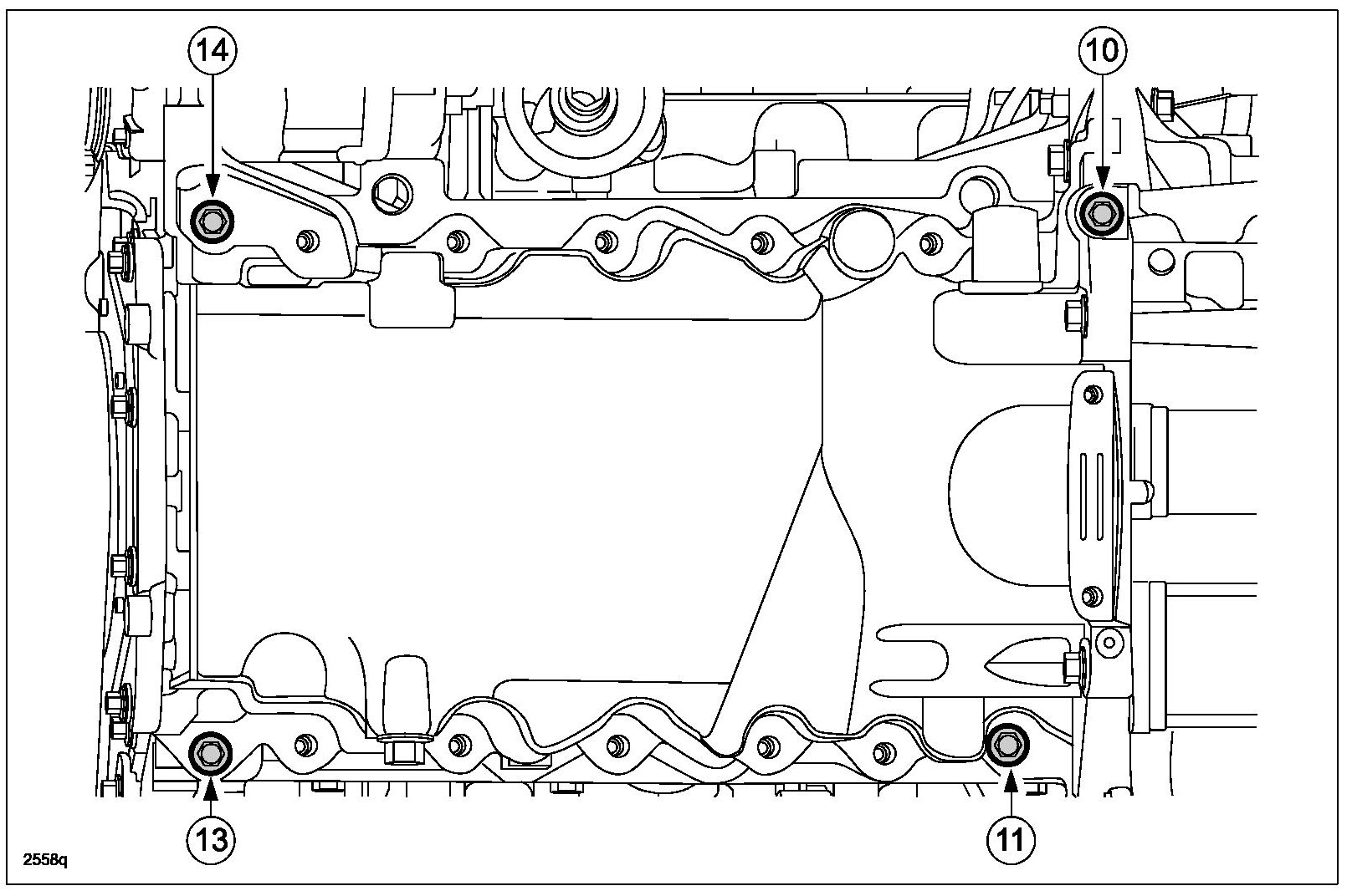 5. With the help from an assistant, install the oil pan and bolts 10, 11, 13 and 14 finger tight.