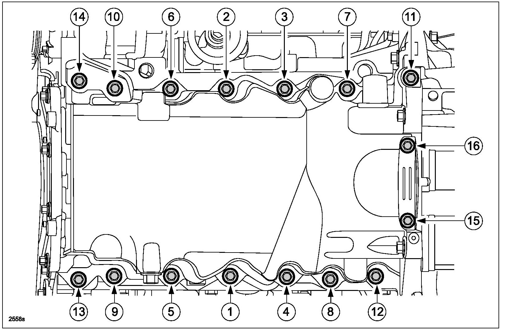 9. Install the remaining oil pan bolts and tighten in the four steps shown.