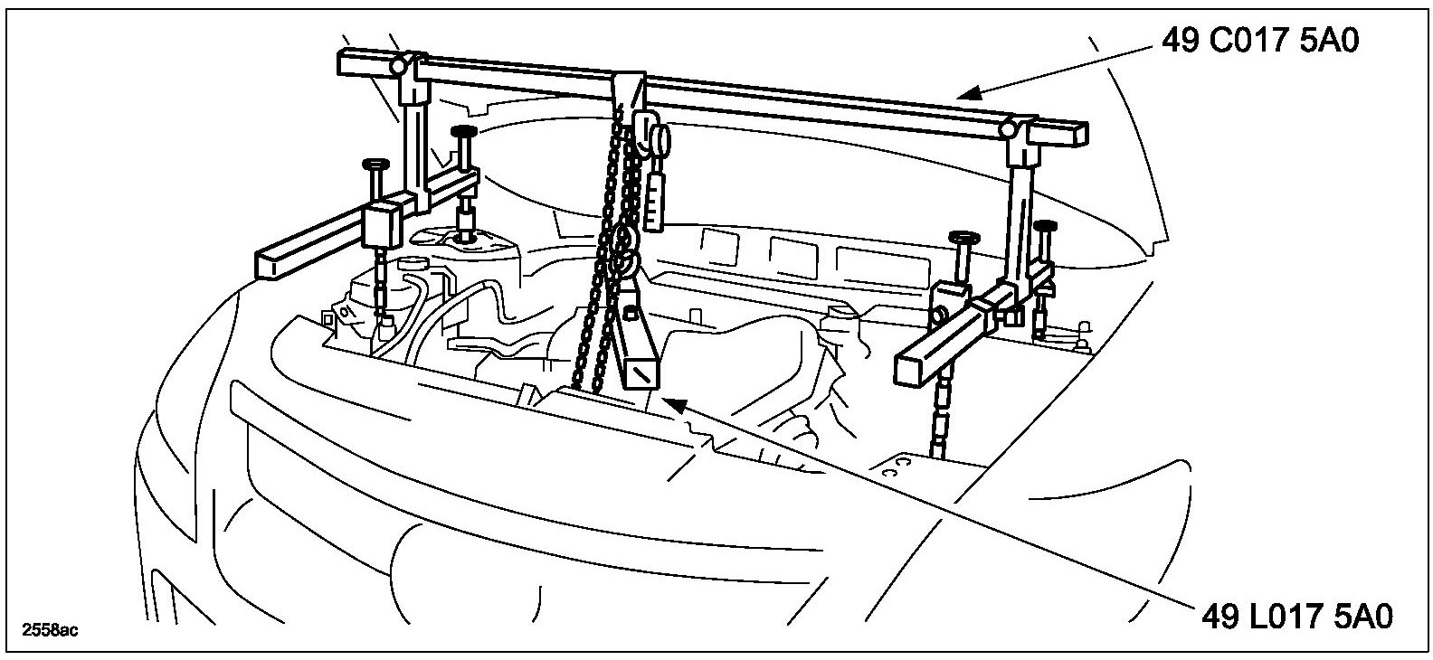 34. Remove the engine support kit SST 49C0-17-5A0 and support hanger SST 49L0-17-5A0.