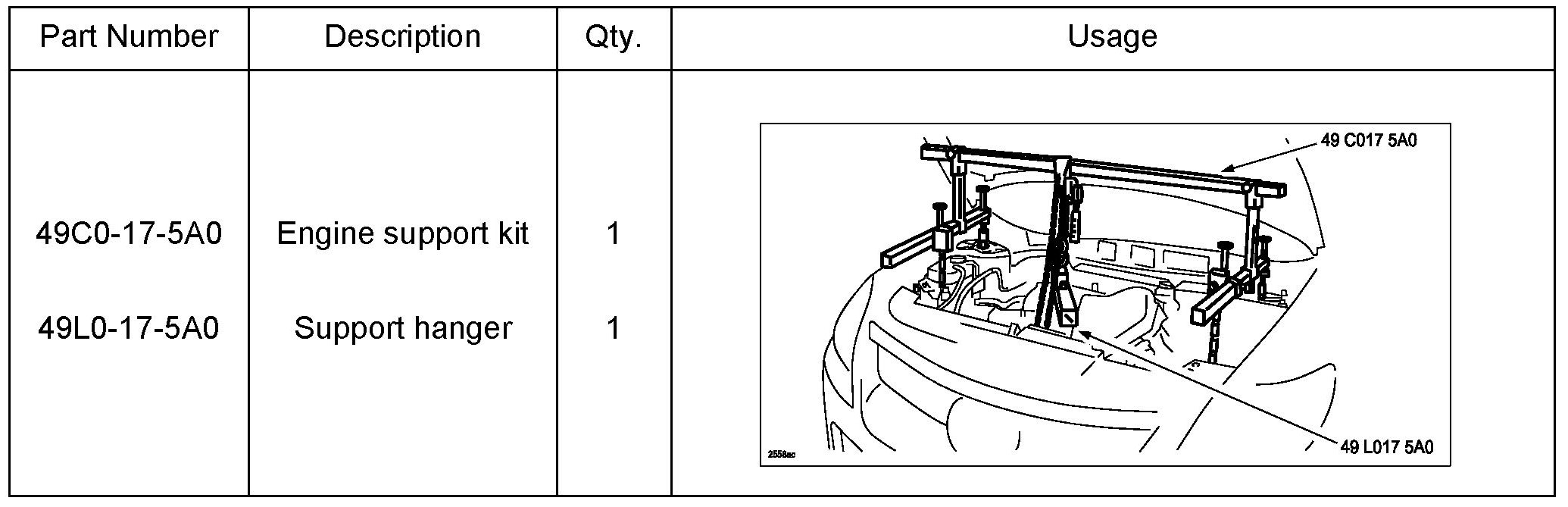 8. Install the engine support kit SST 49C0-17-5A0 and support hanger SST 49L0-17-5A0. The tools are available on Mstore.